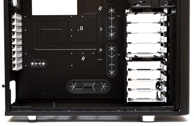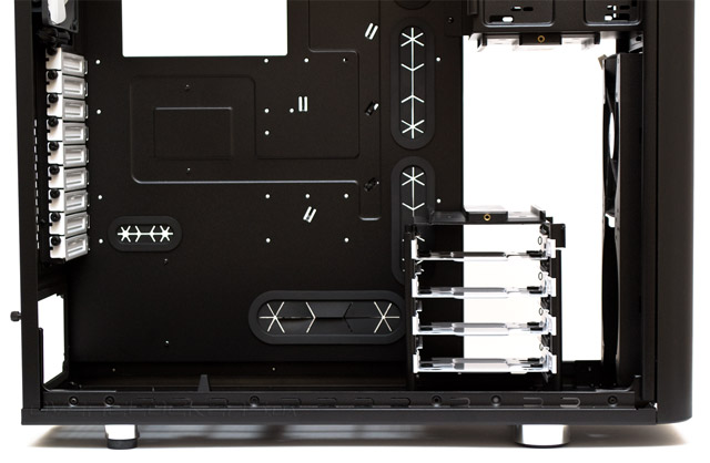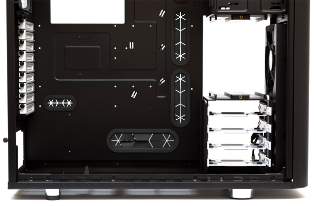 Поддон материнской платы имеет семь крупных прорезиненных отверстий и столько же проушин для скрытой укладки проводов. Отверстие для усилительной пластины достаточно большое, расположено удачно и подойдет по габаритам под все современные процессорные разъемы. Расстояние от поддона до правой боковой дверцы составляет 26 мм, чего вполне хватает для нормальной укладки всех кабелей.