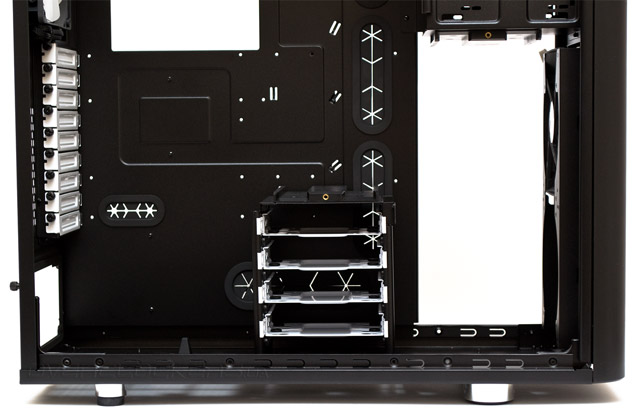 Arc XL поддерживает аналогичные с Define XL R2 возможности по конфигурации положения накопителей. Изначально мы имеем две съемные корзины, по четыре 2,5″ или 3,5″ накопителя в каждой.