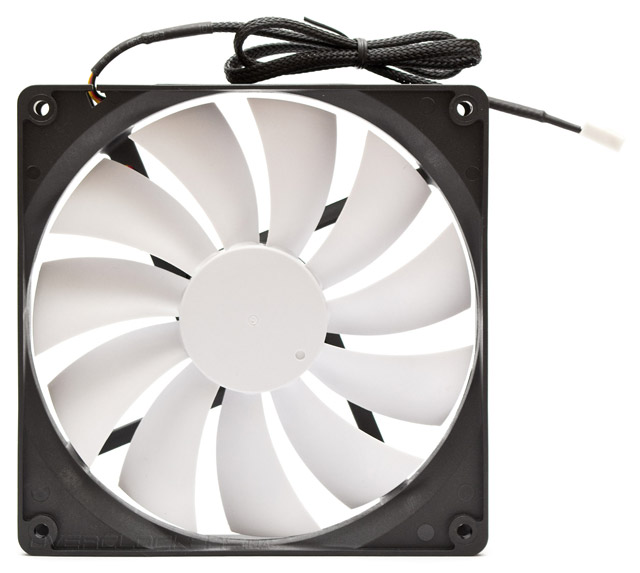 В корпусе предустановленны три одинаковых 140-мм вентилятора, относящихся к линейке Fractal Design Silent Series R2, выполненной на основе гидродинамического подшипника. Длина их шнуров в оплетке составляет 500-мм, подключение — трехконтактное. Крыльчатка стартует с 4 В и 400 об/мин, создавая не более 35 дБ (А) шума. При 7 В получаем 650 об/мин и все еще тихие 37 дБ (А). На полной скорости (12 В, 1000 об/мин) вентилятор становится заметен, создавая звуковое давление в 43 дБ (А). Подшипник издает легкое потрескивание, которое может слегка расстроить любителей абсолютной тишины. Маркировку и заявленные технические характеристики можно рассмотреть на фотографии.