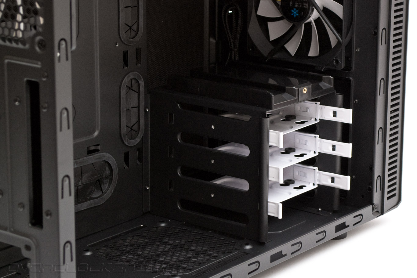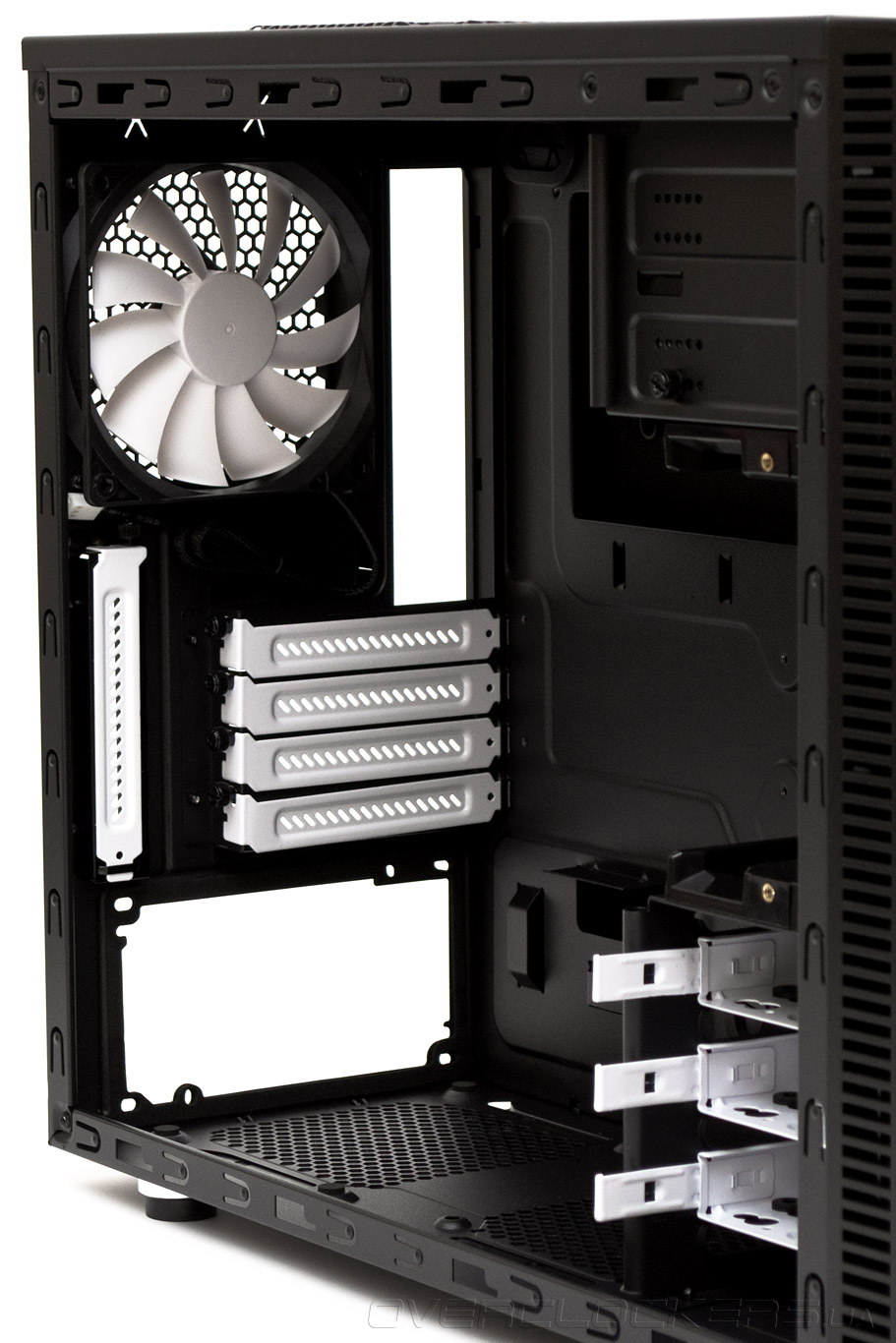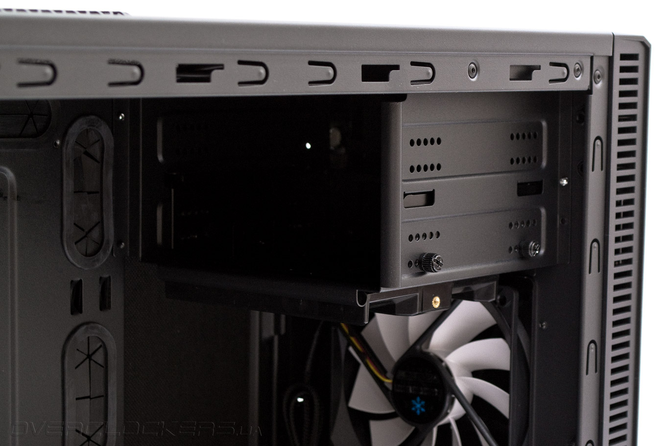 Сняв среднюю корзину, видим передний предустановленный 120-мм вентилятор, полностью идентичный заднему. Теперь в корпусе можно разместить самые длинные платы расширения. Для повышения совместимости возможно демонтировать нижние пластиковые салазки, однако сама корзина в данном шасси не снимается в отличии от старшего собрата Define R4.