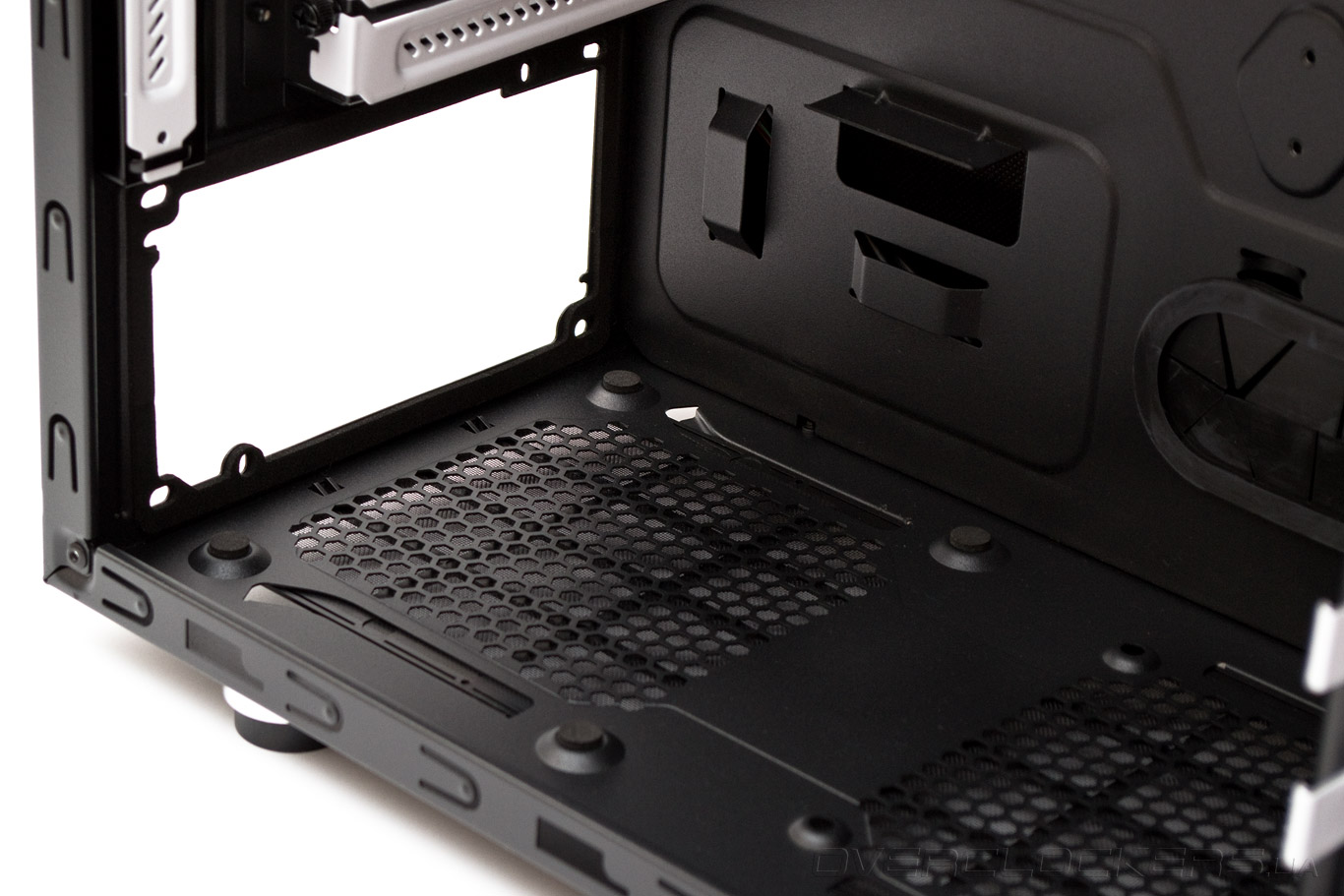Для укладки кабелей между поддоном и боковой панелью предусмотрено всего 15 мм пространства. Если бы не большое количество проушин — распределить проводку было бы сложно. Шесть отверстий для протяжки проводов прорезинены, что способствует опрятному внешнему виду системы. Вырез напротив усилительной пластины процессорного кулера мало совпадает с расположением современных сокетов и выполняет скорее вентиляционную функцию.
