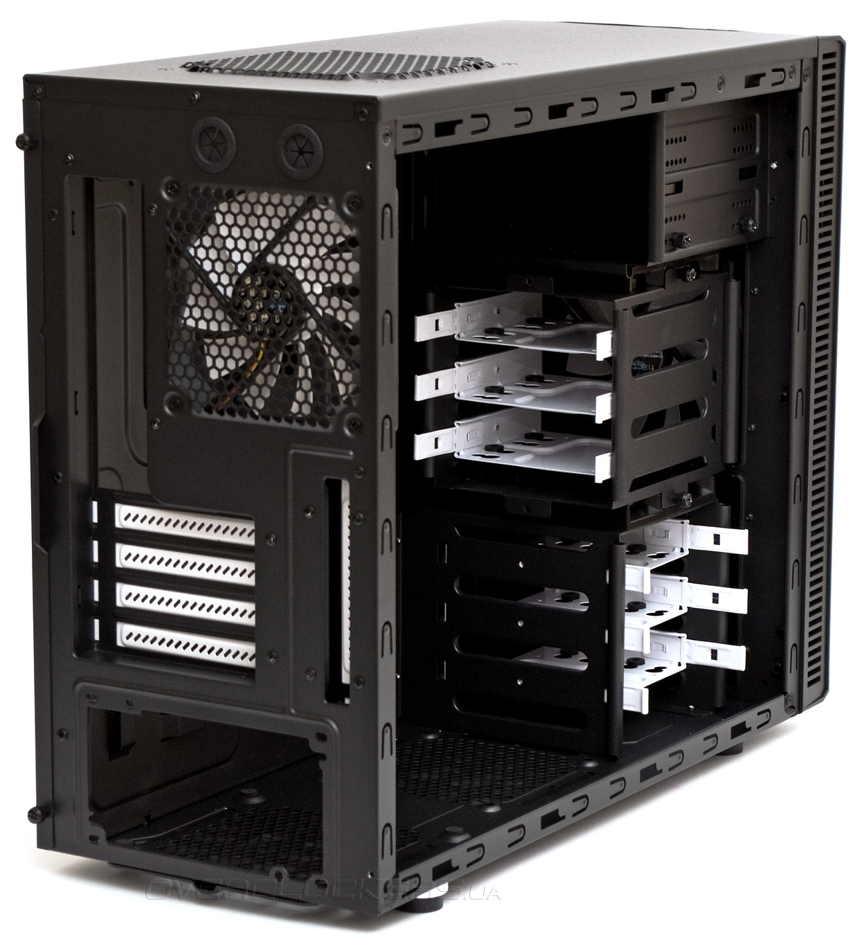 Четыре горизонтальных слота расширения и один боковой вертикальный закрыты вентилируемыми заглушками белого цвета. В качестве фиксаторов выступают винты с накатанной головкой. На выдув предустановлен белый 120-мм пропеллер.