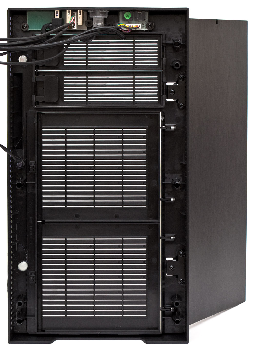 Передняя панель держится на шести пластиковых «тюльпанах» и легко снимается. К ней присоединены провода, перед извлечением их следует ослабить и освободить, чтобы избежать повреждения. Но, по сути, демонтаж этой панели вряд ли потребуется — ко всем компонентам и так есть доступ. Все разъемы передних портов являются модульными и могут быть легко заменены в случае поломки, о чем отдельно упоминается в гарантийном листе компании.
