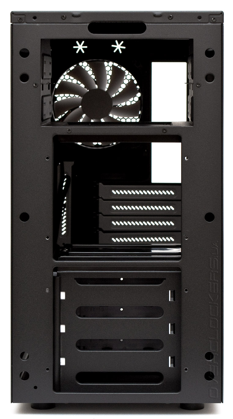 Фронт корпуса без пластиковой панели позволяет нам лучше рассмотреть обоймы двух 120-мм вентиляторов. На наш взгляд они слишком выдаются вперед, из-за чего затрудняется забор воздуха через боковые отверстия. Хорошо то, что извлечь обоймы можно не снимая фронтальную панель. Плохо то, что все равно понадобится отвертка.