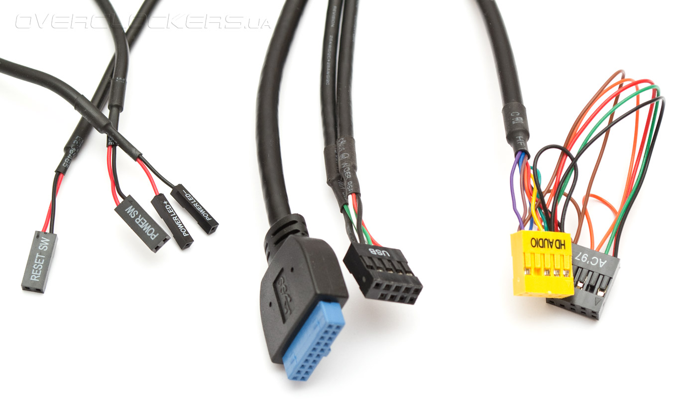 Кабеля передней панели состоят из провода от клавиши перезагрузки и запуска ПК, провода индикатора питания, колодки USB 3.0 для внутреннего подключения, колодки USB 2.0 и аудио-разъемов в вариантах HD Audio и АС'97. Цвет всех проводов черный.
