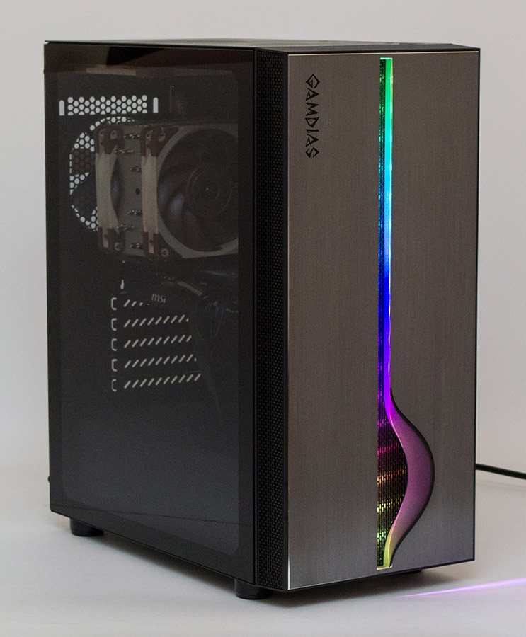 Gamdias Mars M1 представляет собой на вид довольно обычную «коробку», в которой визуально выделяется только фронтальная панель. Она выполнена из шлифованного алюминия и поделена посередине прямой углубленной вставкой в виде сетки, с изгибом в нижней части. Под левой стороной выреза спрятана светодиодная лента. В левом верхнем углу выгравирован логотип производителя.