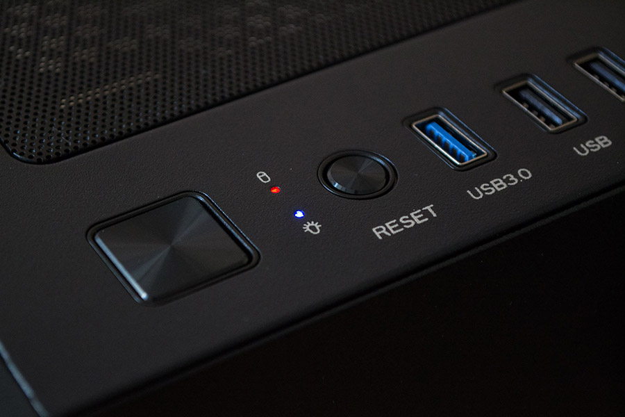 Внешние порты и кнопки вынесены на место вдоль правой грани верхней панели. Среди них есть большая квадратная кнопка запуска ПК, красный индикатор активности накопителей и синий индикатор питания, круглая клавиша перезагрузки системы, один порт USB 3.0, два USB 2.0, два 3,5-мм аудио разъема и круглая клавиша управления подсветкой.