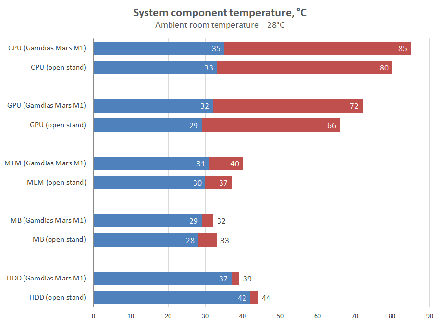Схема охлаждения у Gamdias Mars M1 оказалась на удивление неплохой, как для корпуса с закрытой передней панелью и системой в разгоне. Да, свою роль сыграли и четыре дополнительных вентилятора, но тем не менее. Отставание по температуре процессора от открытого стенда составляет всего пять градусов, что в жарком помещении вполне нормально. Видеокарта прогревается на шесть градусов больше, что тоже не критично. Для памяти разница составляет всего три градуса, а материнская плата в корпусе проветривается на градус лучше. Жесткий диск ощущает себя отменно и вентилируется лучше на пять градусов, чем на открытом стенде. В целом, схема вентиляции в данном корпусе показала себя чуть лучше среднего, но при условии установки полного комплекта пропеллеров.