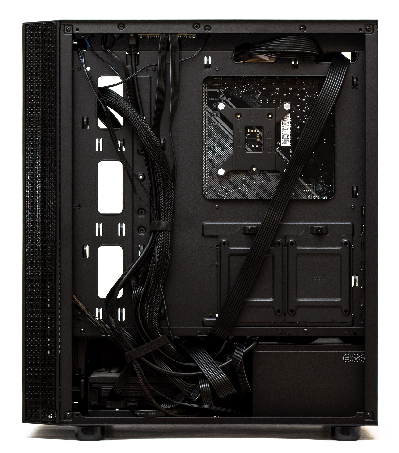 Кожух блока питания снабжен крупной вентиляционной решеткой, на которую можно закрепить при необходимости два 120-мм пропеллера или прикрепить лотки для 2,5″ накопителей. Для протяжки проводов есть четыре отдельных отверстия, расположенных в нужных местах. Вырез перед передней панелью имеет глубину 60 мм, что позволит установить туда радиатор СВО в сборе с вентиляторами.
