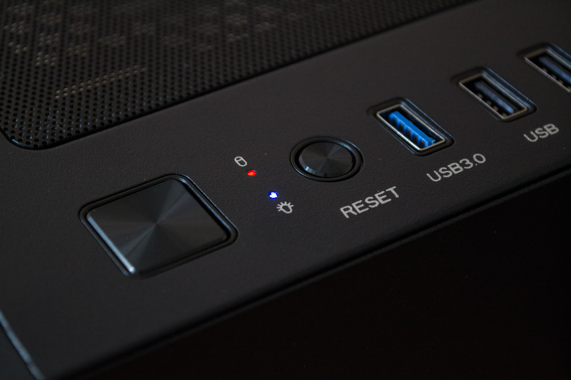 Внешние порты и кнопки вынесены на место вдоль правой грани верхней панели. Среди них есть большая квадратная кнопка запуска ПК, красный индикатор активности накопителей и синий индикатор питания, круглая клавиша перезагрузки системы, один порт USB 3.0, два USB 2.0, два 3,5-мм аудио разъема и круглая клавиша управления подсветкой.
