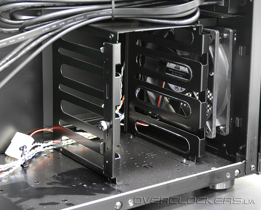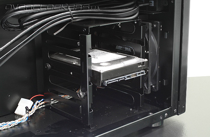 Стойка для крепления устройств 3,5” развернута перпендикулярно корпусу. Рассчитана она на установку трех жестких дисков. Еще один накопитель (причем как типоразмера 3,5" так и «ноутбучного» 2,5"), можно, в случае необходимости, установить во внешний отсек.