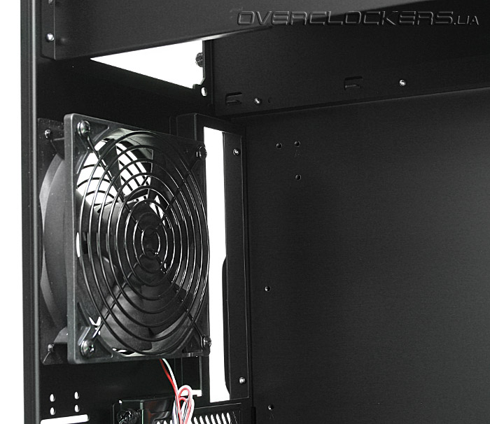 Жесткие диски охлаждаются при помощи 120-мм вентилятора, который закрыт пылевым фильтром. Доступ к его установке можно получить после снятия передней панели.