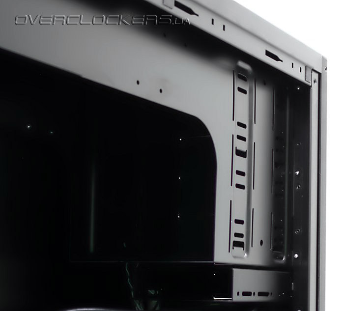 Боковая стенка демонтируется достаточно нетривиальным образом. Ее необходимо, находясь лицом к этой панели, потянуть сначала влево, потом немного на себя и, наконец, вверх. Части или поверхности PC-8NWX Black, которые можно повредить или поцарапать при снятии боковой панели, защищены специальными прокладками, которые расположены в верхней и, соответственно, нижней частях рамы.