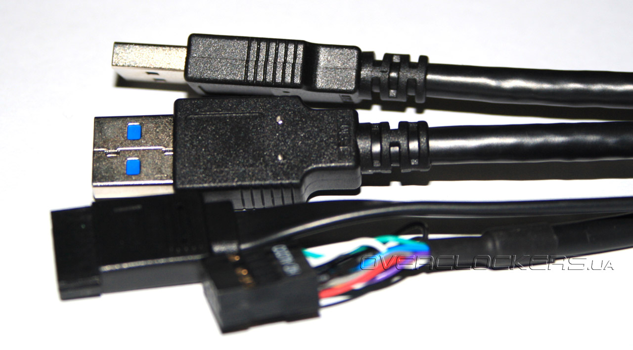 Комплектация предусматривает наличие на передней панели корпуса разъемов USB 3.0, кабели которых подключаются к задней панели платы. Если материнская плата лишена прогрессивного интерфейса, то через переходник разъемы можно подключить непосредственно к ней, но уже к портам второго генерации.