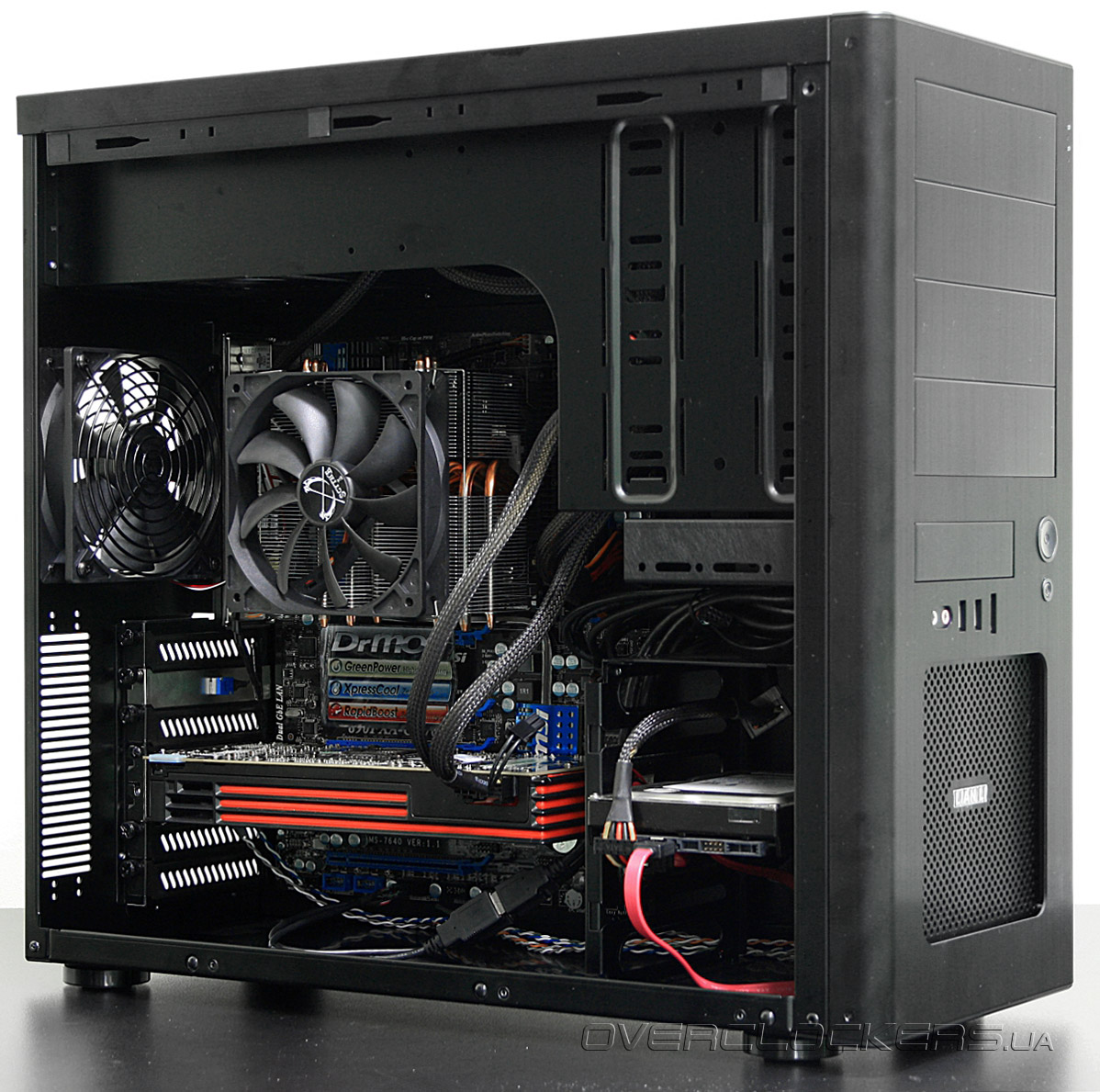 Внутреннее пространство корпуса позволяет с легкостью использовать габаритные системы охлаждения. Расстояние от задней стенки до стойки плат расширения составляет 290 мм, что позволяет использовать любые модели видеокарт практически без ограничений. В случае же острой необходимости пользователь может удалить стойку для накопителей, и тем самым значительно увеличить доступное внутреннее пространство.