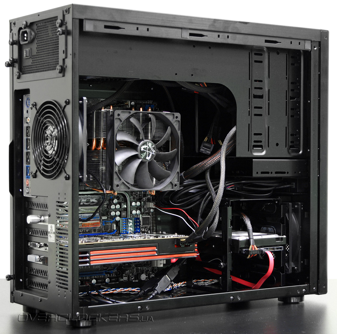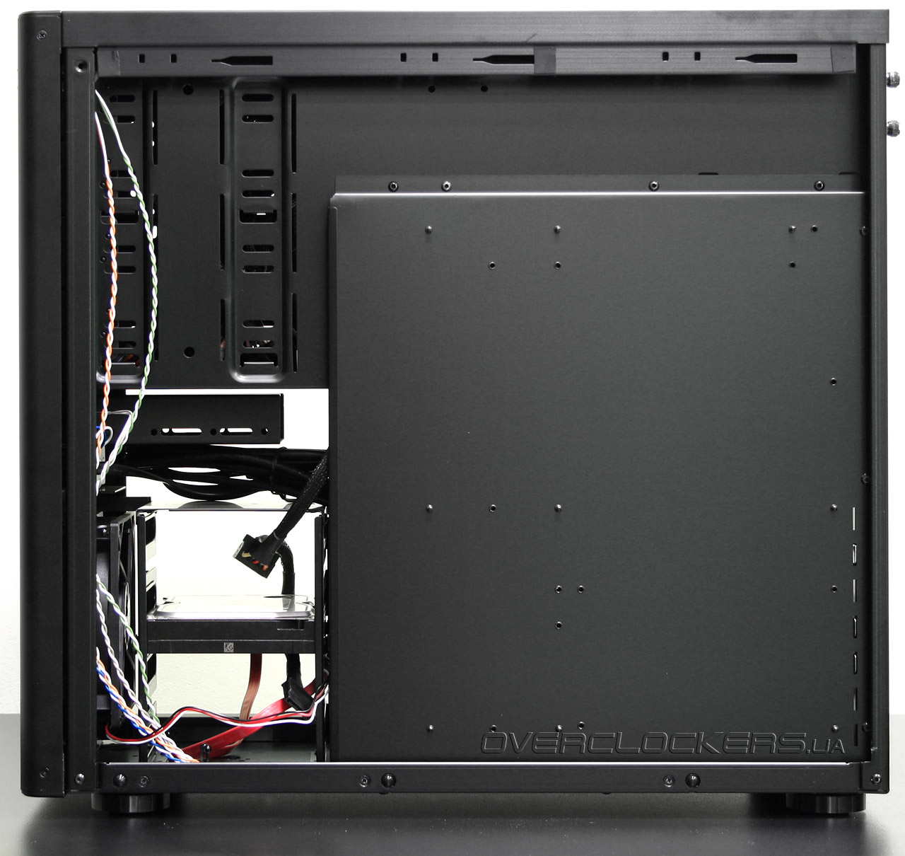 Отверстий для укладки кабелей БП за поддоном материнской платы не предусмотрено. Популярных в последнее время отверстий, облегчающих установку усилительных пластинв процессорных СО, также нет. В целом после сборки, система представляет собой достаточно аккуратный системный блок.