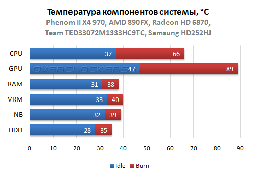 Как видим, сильнее, нежели в предыдущих материалах прогрелась зона размещения оперативной памяти. В остальном — никаких значительных отклонений от нормальных температурных показателей не выявлено.