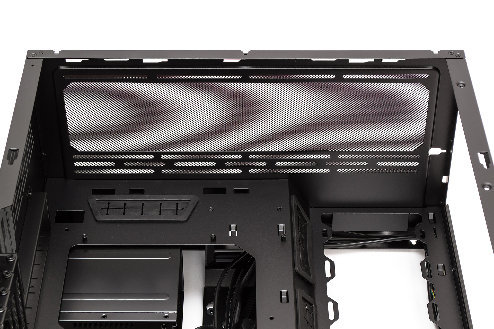 Верхняя часть каркаса корпуса имеет слева большое вентиляционное отверстие с посадочными местами под три 120-мм или два 140-мм пропеллера. Все это закрывается еще одним пылевым фильтром в виде металлической сетки с магнитными полосками по бокам.