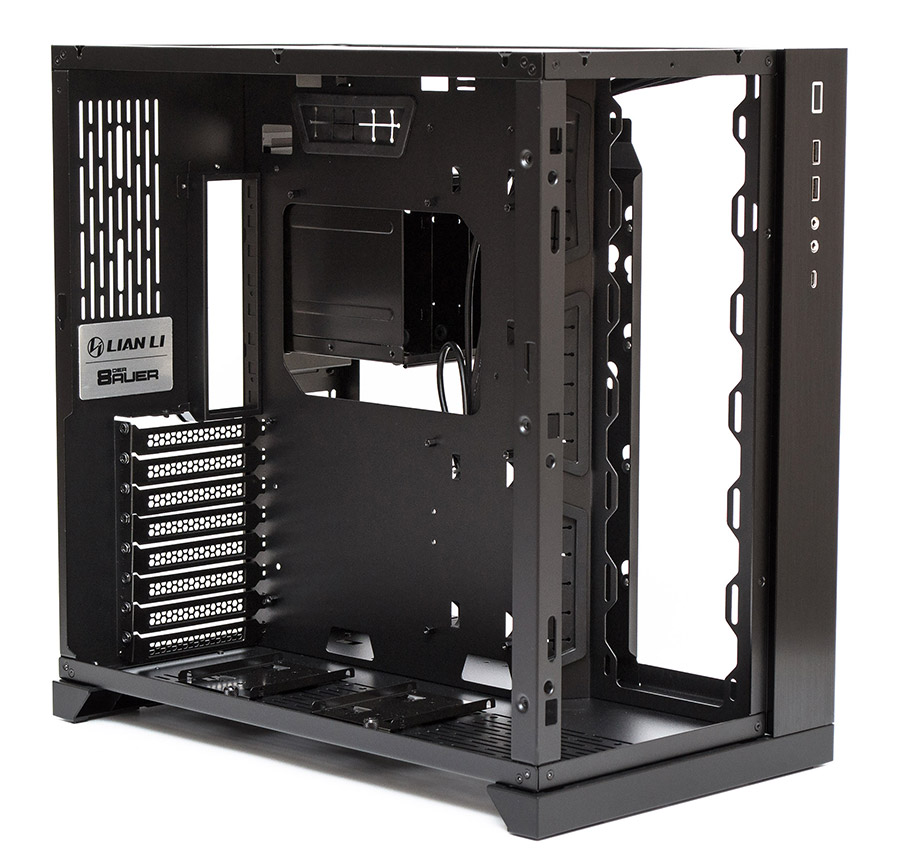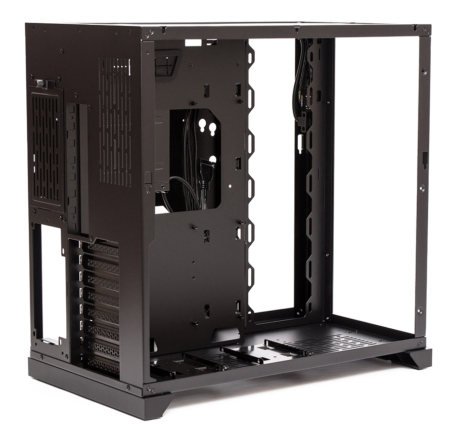Если снять весь обвес, становится виден огромный вырез в поддоне материнской платы для установки усилительной пластины процессорного кулера и 11 проушин для крепления кабельных стяжек. Запас пространства за поддоном сзади равняется 90 мм, в передней его части — 50 мм. Три трапециевидных отверстия для протяжки проводов в районе центральной стойки закрыты резиновыми шторками.