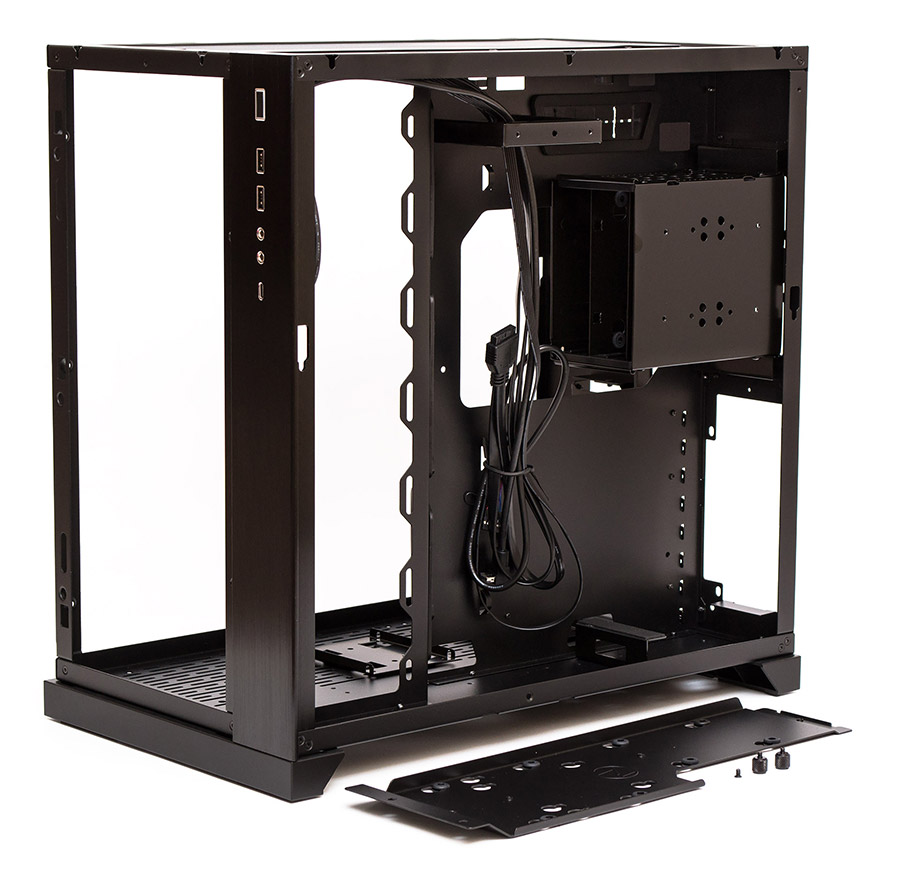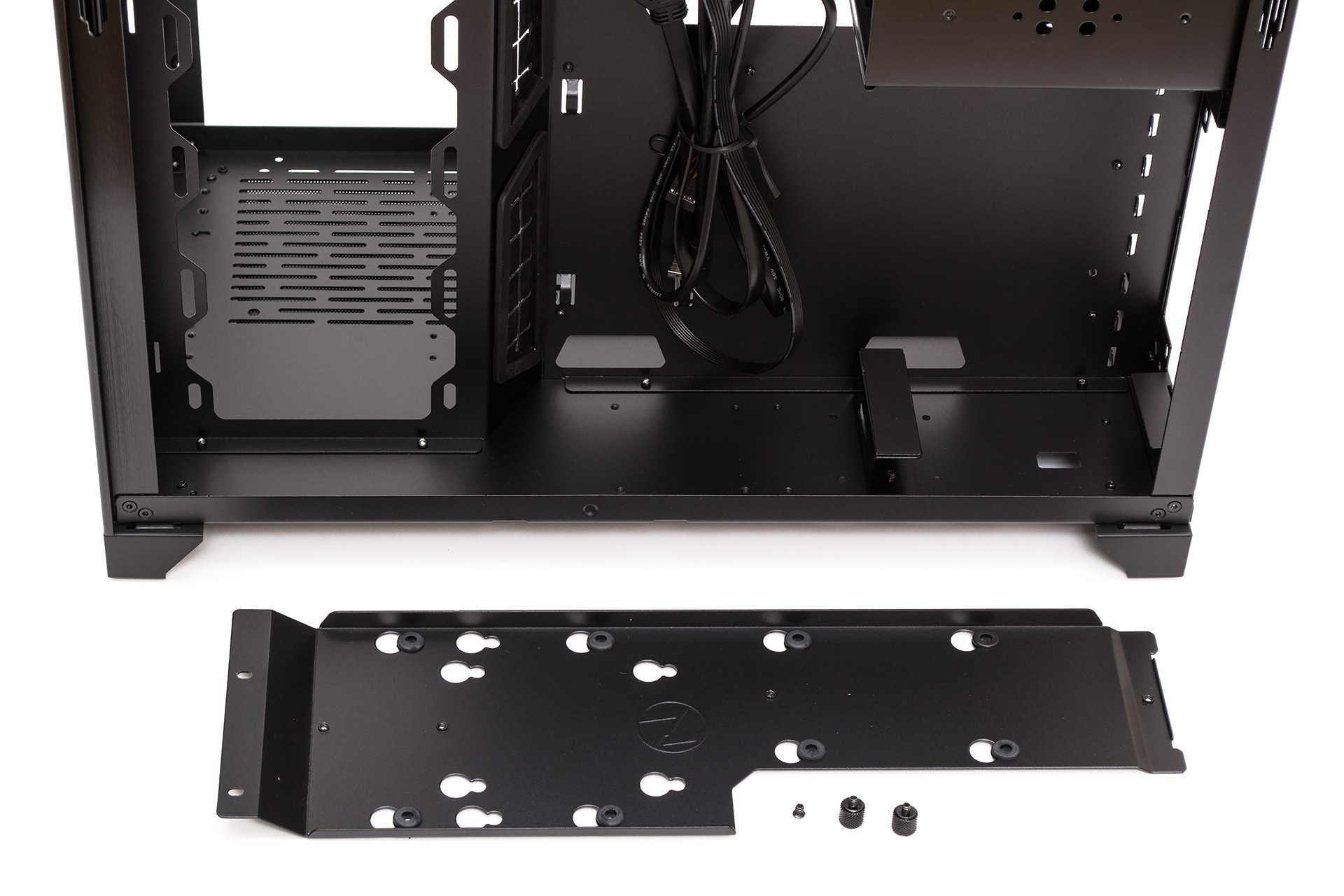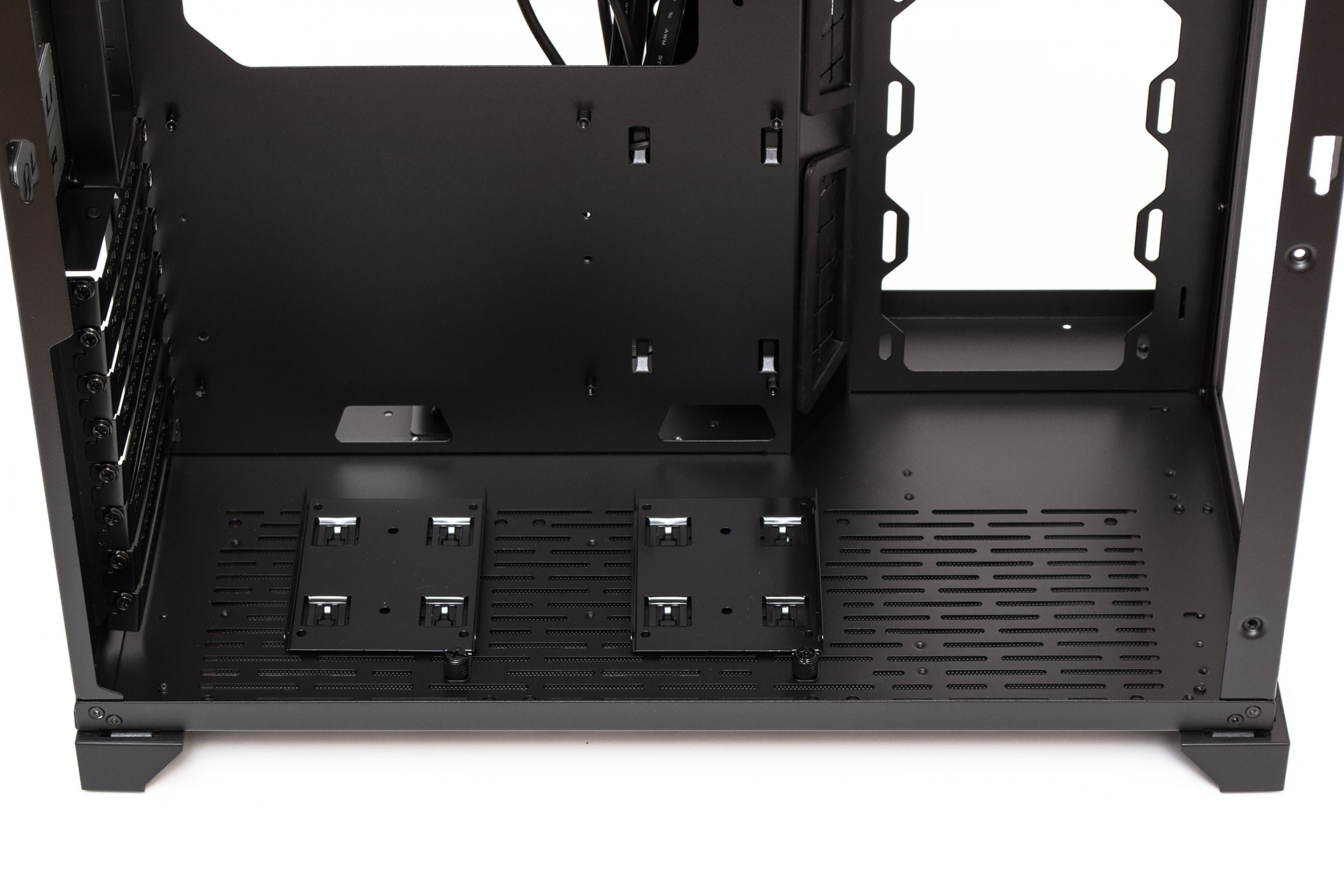 На нижней панели по умолчанию закреплены, с помощью одного винта с накатанной головкой каждый, два лотка для 2,5" накопителей. Если их снять, то на низ можно установить до трех 120-мм вентиляторов или радиаторов СЖО подходящего типоразмера. Либо, альтернативно установить сюда вертикальное крепление и рейзер для видеокарты, продающиеся отдельно. Внизу поддона материнской платы есть два отверстия для протяжки проводов.