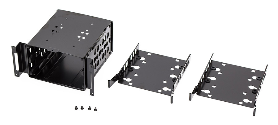 Корзина держится на четырех винтах. Внутри по бокам в ней есть пластиковые направляющие. Лотки металлические, с резиновыми демпферами снизу. В каждый из них при помощи винтов с крупными шляпками можно поставить по одному 2,5″ или 3,5″ накопителю.