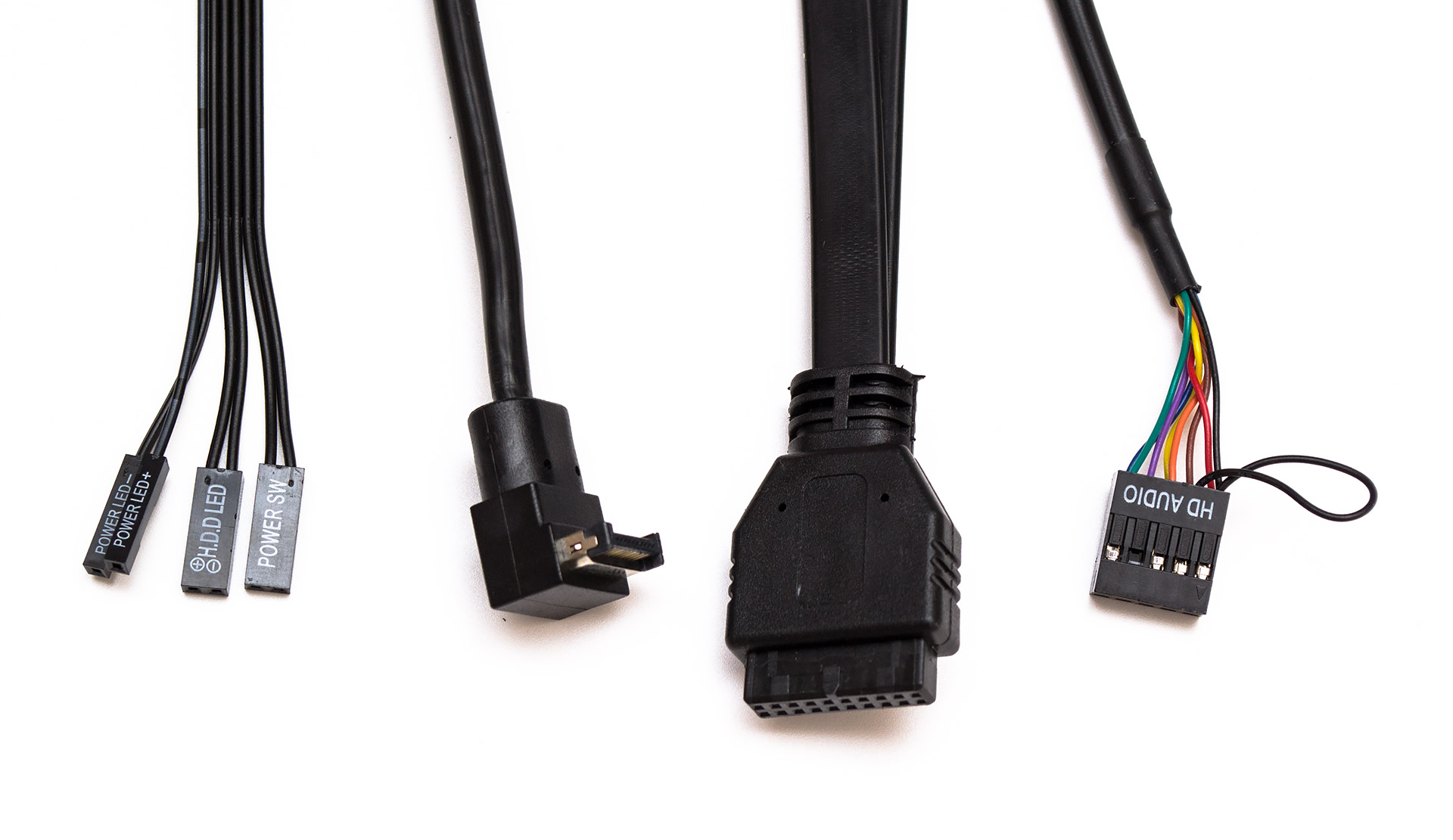 В набор кабелей от корпуса входит: три пары проводов от кнопки запуска системы, индикатора питания и активности накопителей, разъем USB 3.1, колодка USB 3.0 и разъем HD Audio. Все провода полностью окрашены в черный цвет и имеют достаточную для подключения длину.