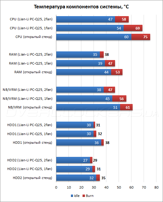 Пожалуй, тяжело придумать современный корпус, в котором материнская плата с интегрированным процессором охлаждалась бы хуже, чем на открытом стенде. С одним вентилятором PC-Q25 обеспечивает комплектующим такой же тепловой режим, как и ближайший сосед по линейке, Lian-Li PC-Q11. От подключения второго вентилятора, естественно, хуже не становится, и рассматриваемый корпус однозначно вырывается в лидеры по уровню вентиляции среди компактных устройств производителя. Отличный результат, как для решения с такой развитой внутренней структурой.