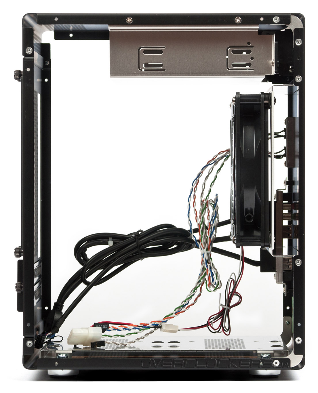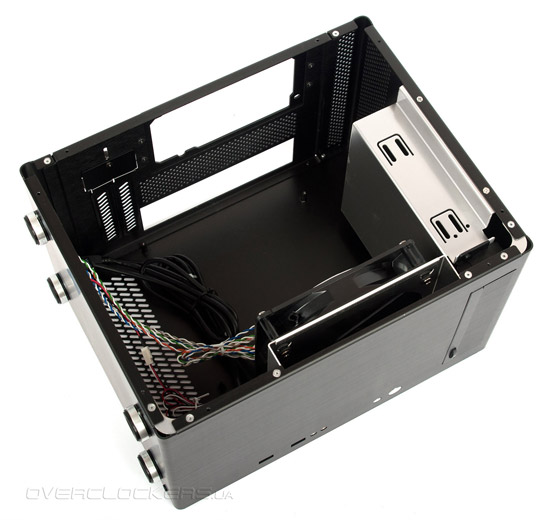 Все шесть стенок модели PC-Q11B выполнены в черном цвете как изнутри, так и снаружи. Другие детали — корзина для оптического привода, пластины для жестких дисков и вентилятора — покраске либо анодированию не подвергались. Отметим наличие двух заглушек под карты расширения PCI Express вместо одной у PC-Q07.