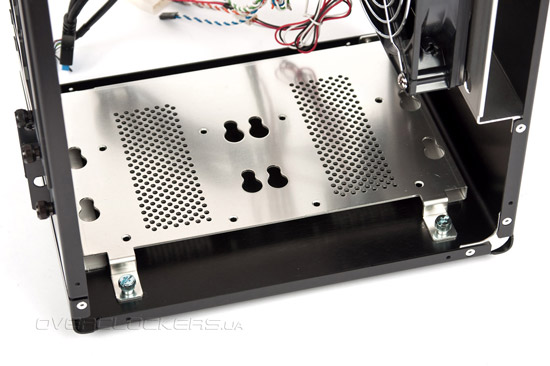 Еще одно удобство заключается в появлении полноценной платформы для двух 3,5-дюймовых HDD и двух 2,5-дюймовых HDD/SSD-накопителей. Последние монтируются между пластиной и днищем шасси «брюшком» вверх. Платформа перфорирована во избежание перегрева винчестеров.