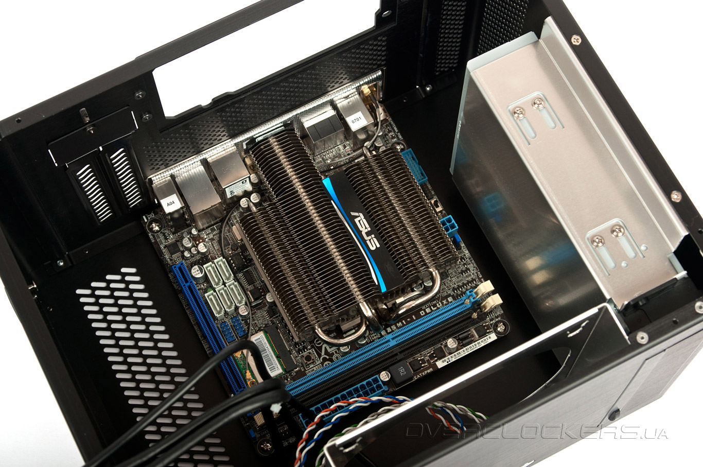 На базе корпуса Lian Li PC-Q11 было решено построить малошумный ПК. Комплектующие подбирались соответствующим образом. Основой системы стала материнская плата ASUS E35M1-I Deluxe с набортным процессором AMD E-350 (Zacate) и пассивным охлаждением. Кроме того, были задействованы две планки оперативной памяти GoodRAM DDR3-1600, жесткий диск Seagate ST3500418AS, пишущий DVD-привод LG и блок питания Enermax MODU87+ 500W.