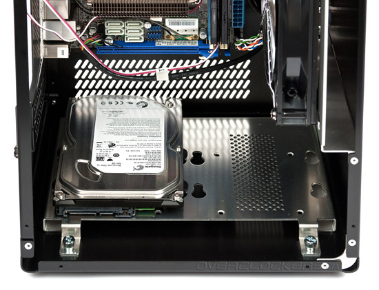 Затем корзина возвращается на место и прикручивается четырьмя винтами к загнутым краям верхней панели корпуса. Опять же, отмечаем оригинальность подхода инженеров Lian Li к проектированию шасси. Модульное строение PC-Q11 позволяет демонтировать «карман» для 5,25" устройства без ущерба для эстетического восприятия.