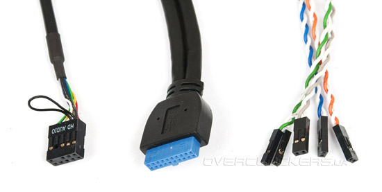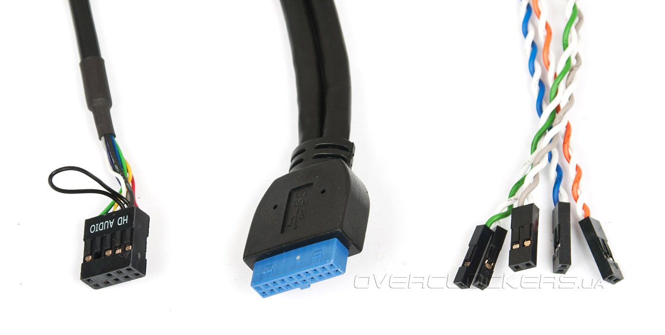 К ASUS E35M1-I Deluxe подключены кабели, тянущиеся от передней панели: HD Audio обеспечивают работу двух Mini-Jack для наушников и микрофона, 19-контактный кабель универсальной последовательной шины сообщается с портами USB 3.0, остальные провода отвечают за функционирование светодиодных индикаторов, кнопок Power и Reset.