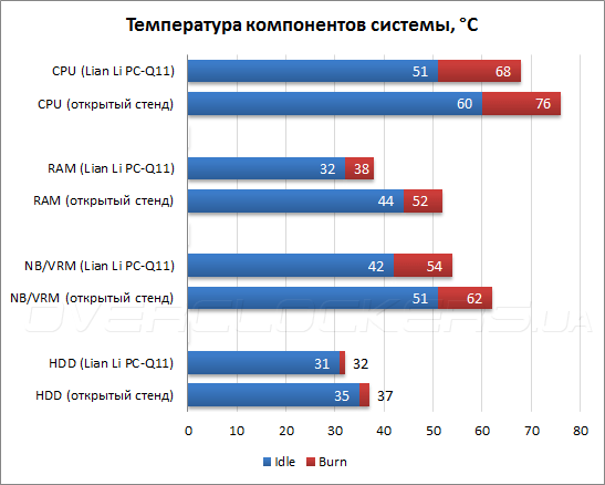 По итогам серии тестов можно сделать однозначный вывод: в корпусе Lian Li PC-Q11 комплектующие охлаждаются гораздо эффективнее, чем на открытом стенде. Большую роль в этом играет предустановленный 140-мм вентилятор и грамотная перфорация стенок шасси. Горячий воздух выбрасывается наружу, в том числе, с помощью вентилятора блока питания через заднюю панель.