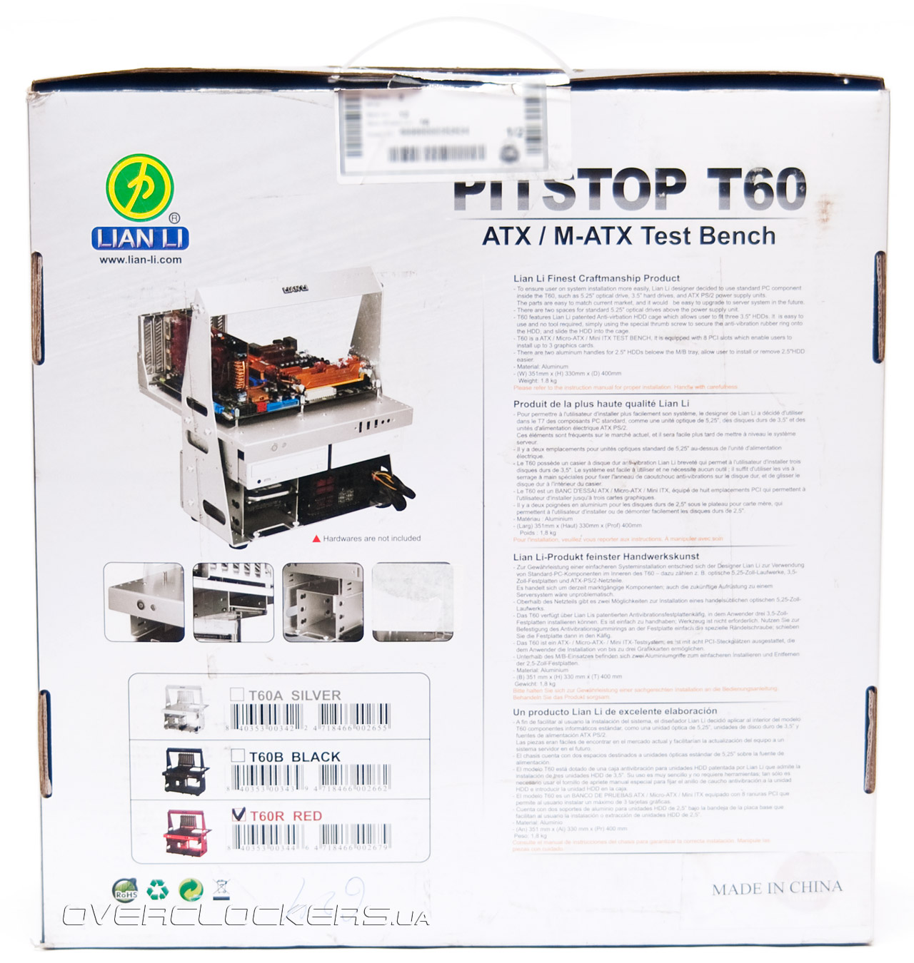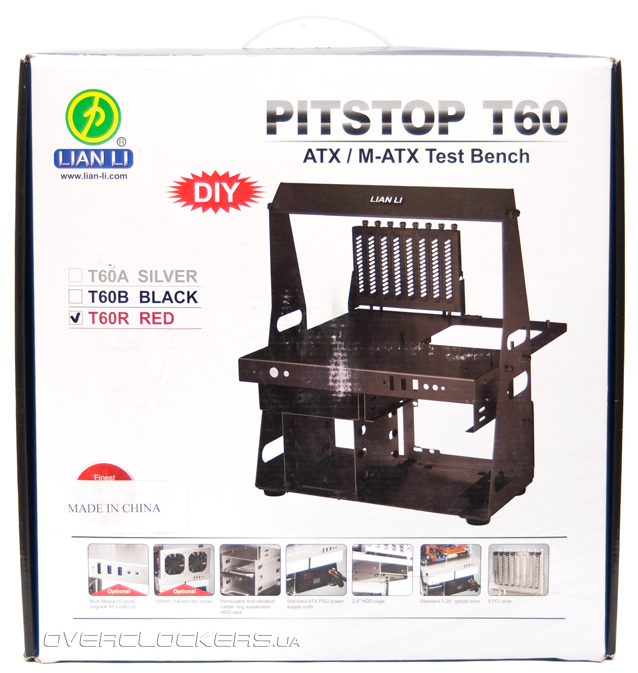 Теперь вернемся к нашему гостю. Рассматриваемый корпус стал продолжением представленной в прошлом году линейки Pitstop, которая взбудоражила публику нестандартным дизайном первой модели T1. Изделие в виде небольшого паука, рассчитанное на платы Mini-ITX, естественно, для покорения оверклокерского олимпа не подходило. Скорее, его выпустили для ценителей неординарных и оригинальных вещей. Спустя полгода компания анонсировала бенч-стенды уже классического дизайна под материнские платы форм-фактора mATX и ATX, T7 и T60 соответственно. Маленький корпус вряд ли может заинтересовать бенчеров и тестеров, а вот полноформатный Lian Li T60 без проблем найдет своего хозяина. С ним как раз мы и познакомимся.