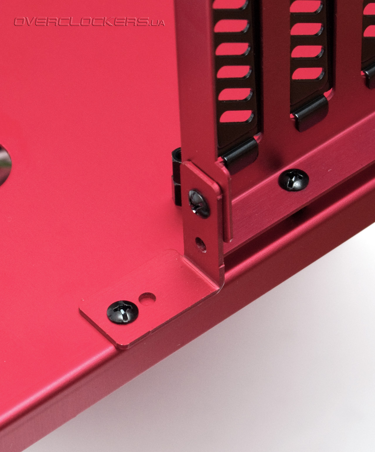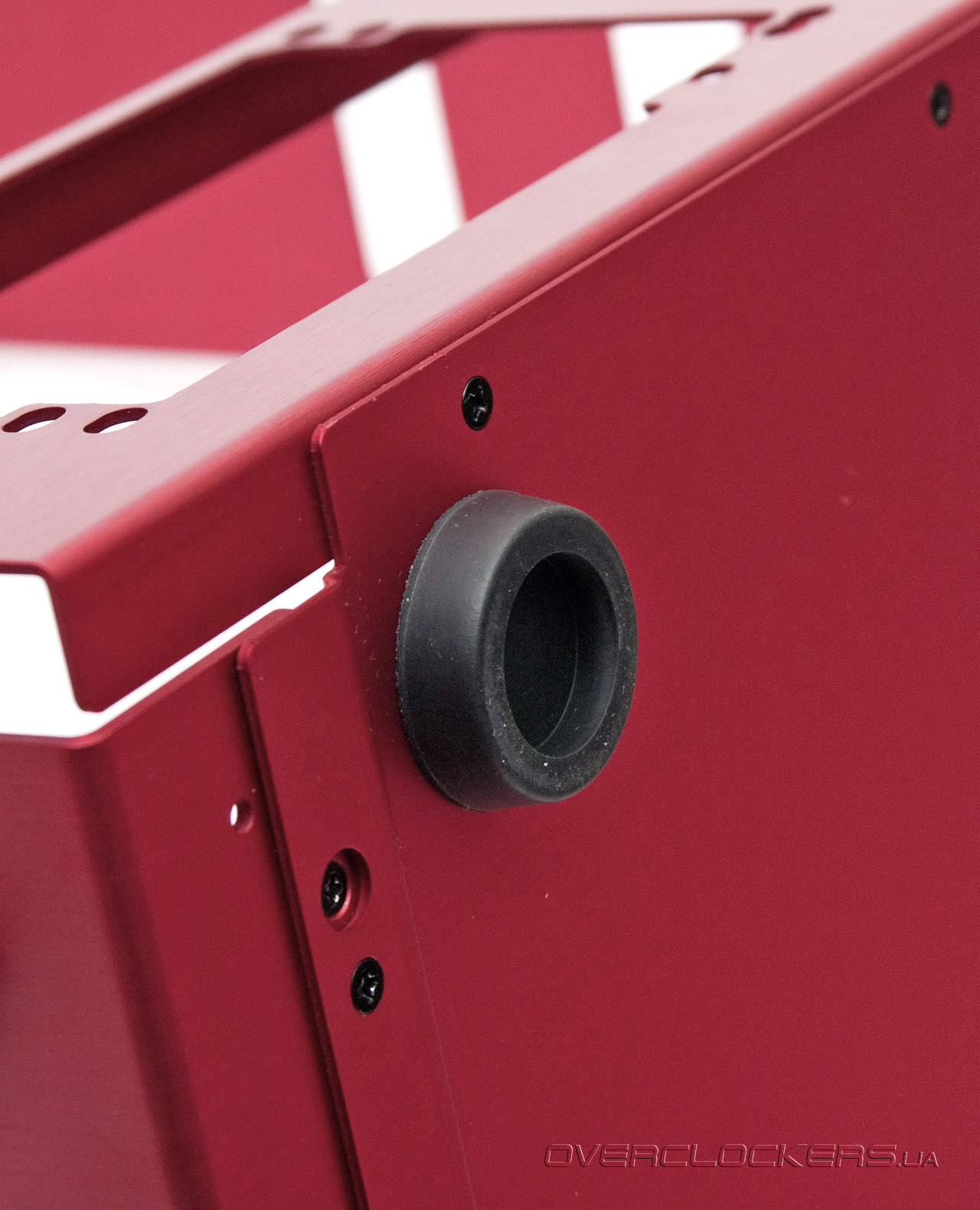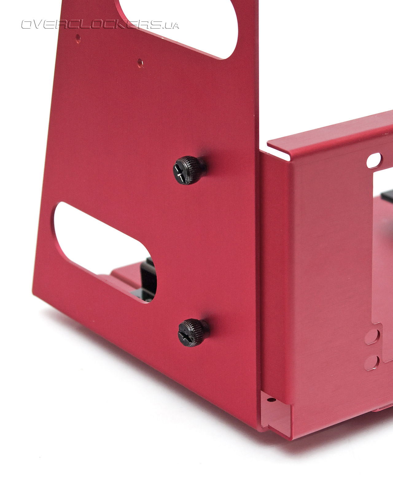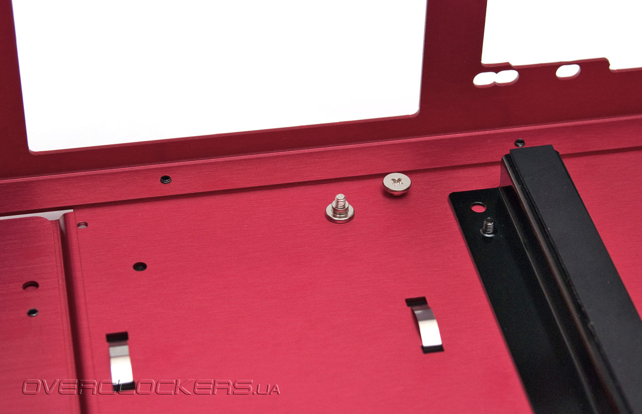 Многие открытые корпуса лишены такой полезной вещи, как стойка для крепления плат расширения. Инженеры Lian Li не забыли о ней. К тому же, снабдили ее заглушками. Такой подход к мелочам не может не радовать. Корзина для накопителей HDD съемная, с демпфирующими прокладками для гашения вибрации от жестких дисков. Также прокладки используются на стойках под блоком питания. Верхняя перекладина, усиливающая жесткость конструкции может использоваться в качестве ручки для переноса собранной системы. Для придания эстетичного вида крепление каркаса и заглушек осуществляется за счет вороненых винтов с накатанной головкой.