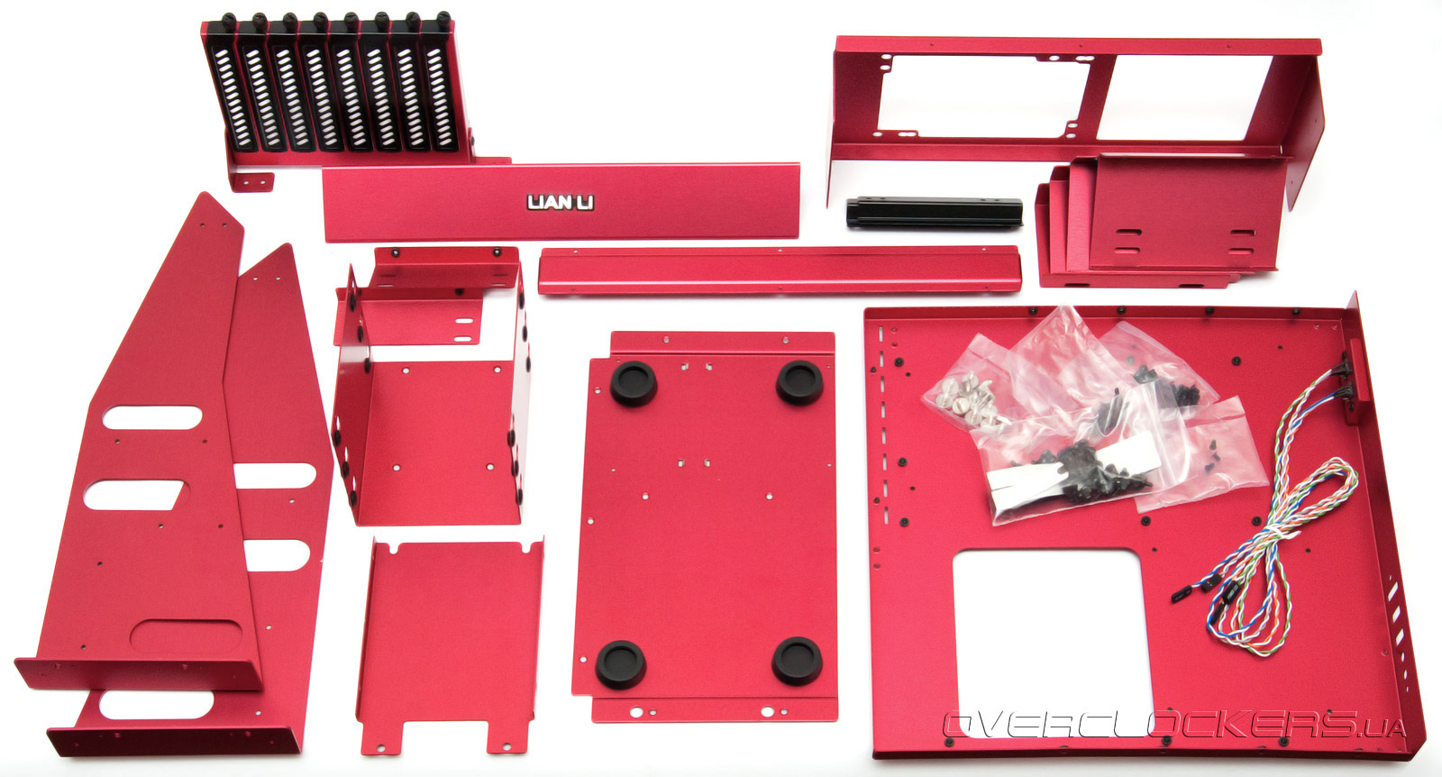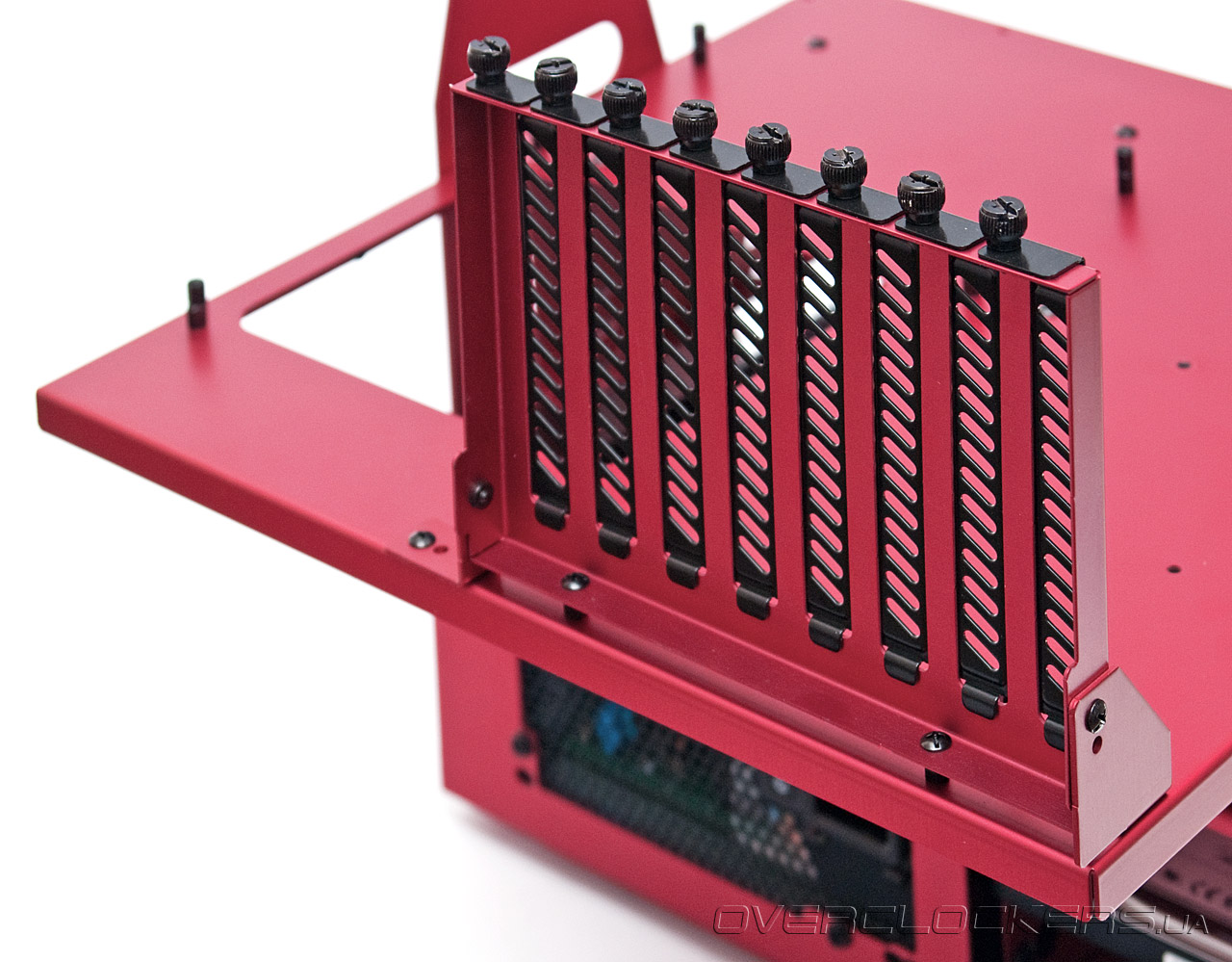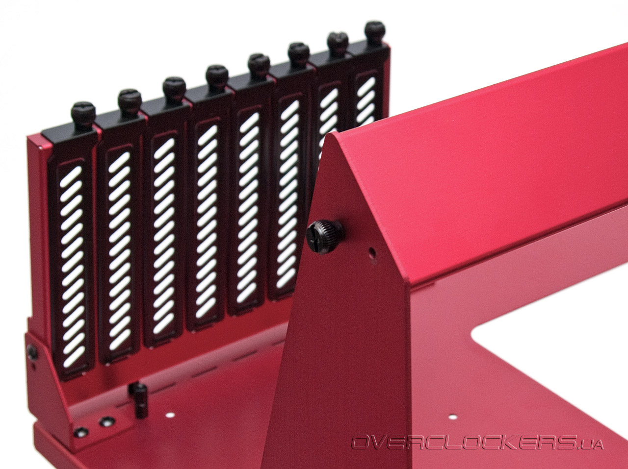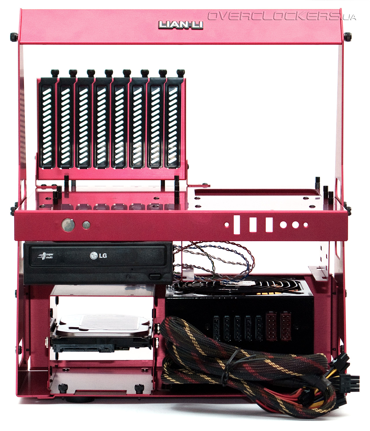 Многие открытые корпуса лишены такой полезной вещи, как стойка для крепления плат расширения. Инженеры Lian Li не забыли о ней. К тому же, снабдили ее заглушками. Такой подход к мелочам не может не радовать. Корзина для накопителей HDD съемная, с демпфирующими прокладками для гашения вибрации от жестких дисков. Также прокладки используются на стойках под блоком питания. Верхняя перекладина, усиливающая жесткость конструкции может использоваться в качестве ручки для переноса собранной системы. Для придания эстетичного вида крепление каркаса и заглушек осуществляется за счет вороненых винтов с накатанной головкой.