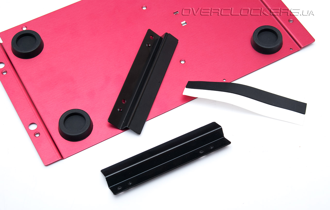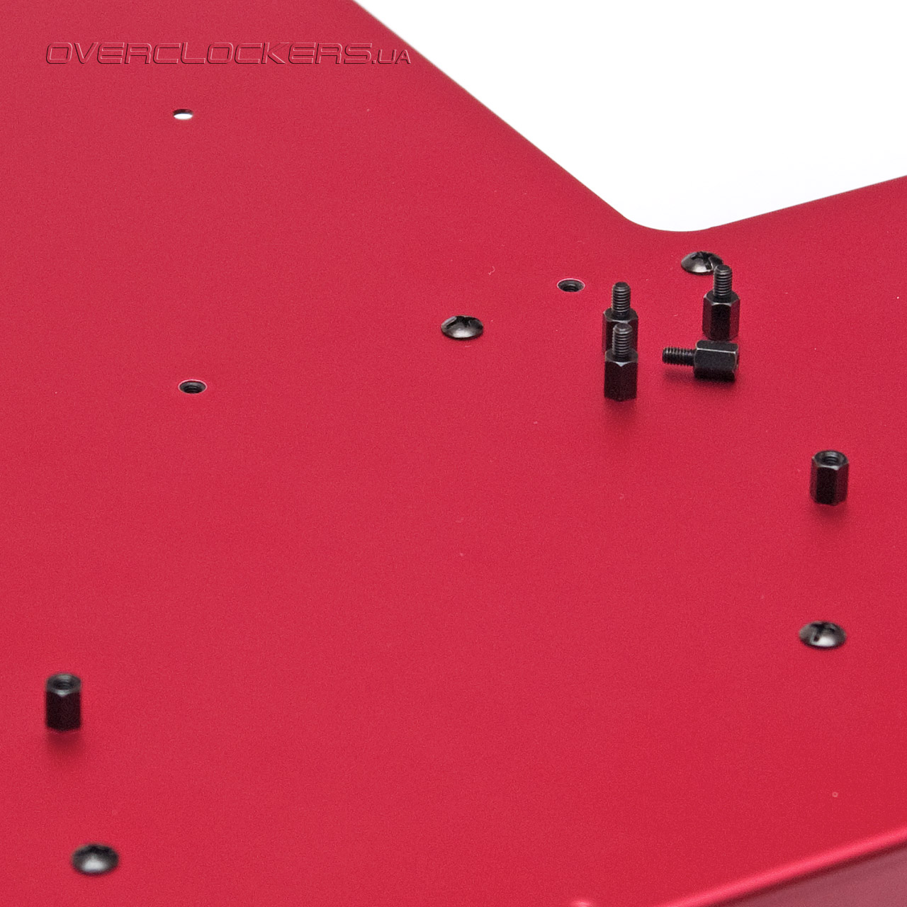 На тестирование попал корпус красного цвета (скорее, бордового), но в модельном ряду присутствуют еще черный и серебристый. Весь комплект выдержан в красно-черном стиле. Из общего ряда выбивается разве что набор винтов для крепления жестких дисков. Для облегчения сборки есть небольшой ключик, позволяющий вкрутить в основную панель шестигранные стойки для установки материнской платы.