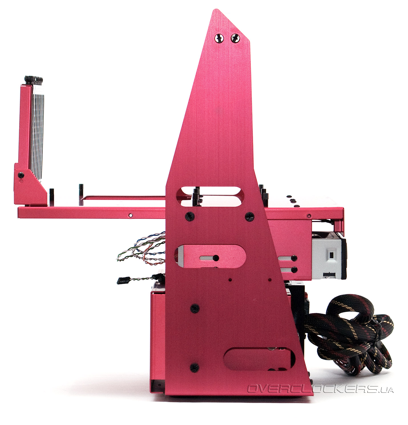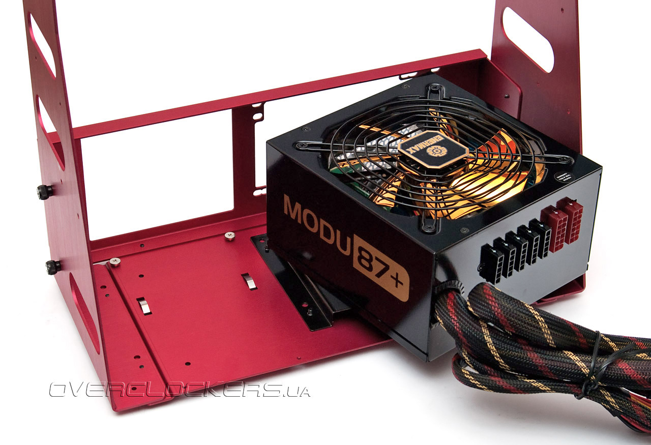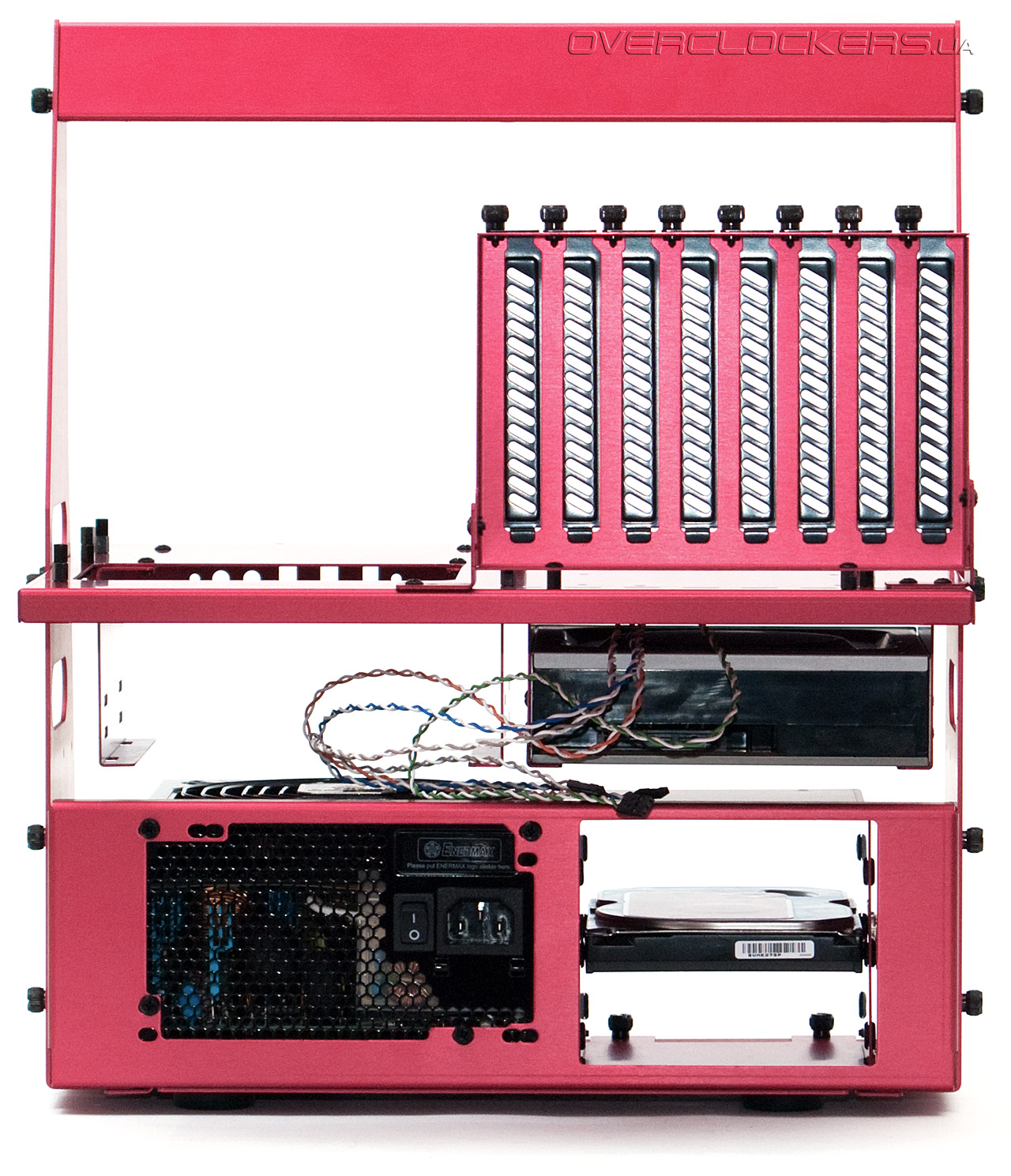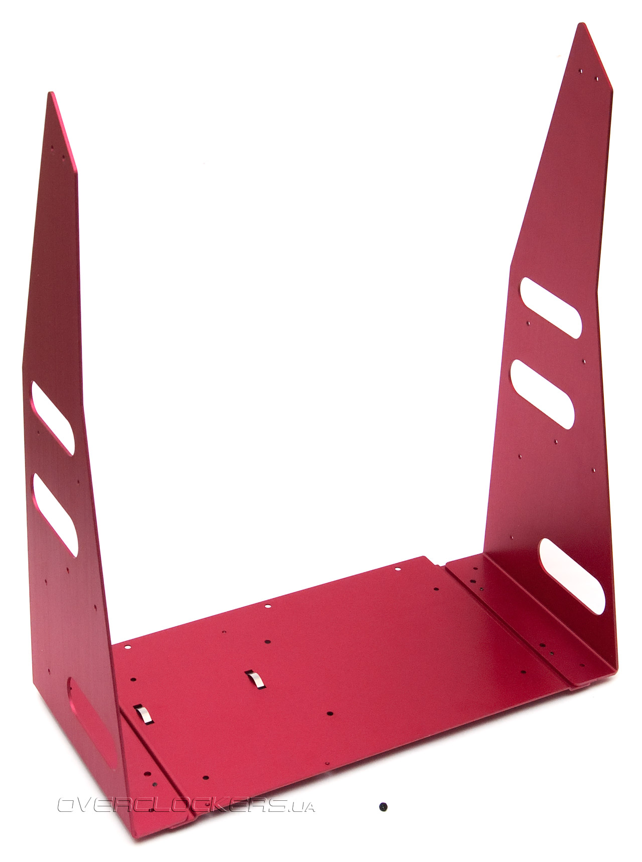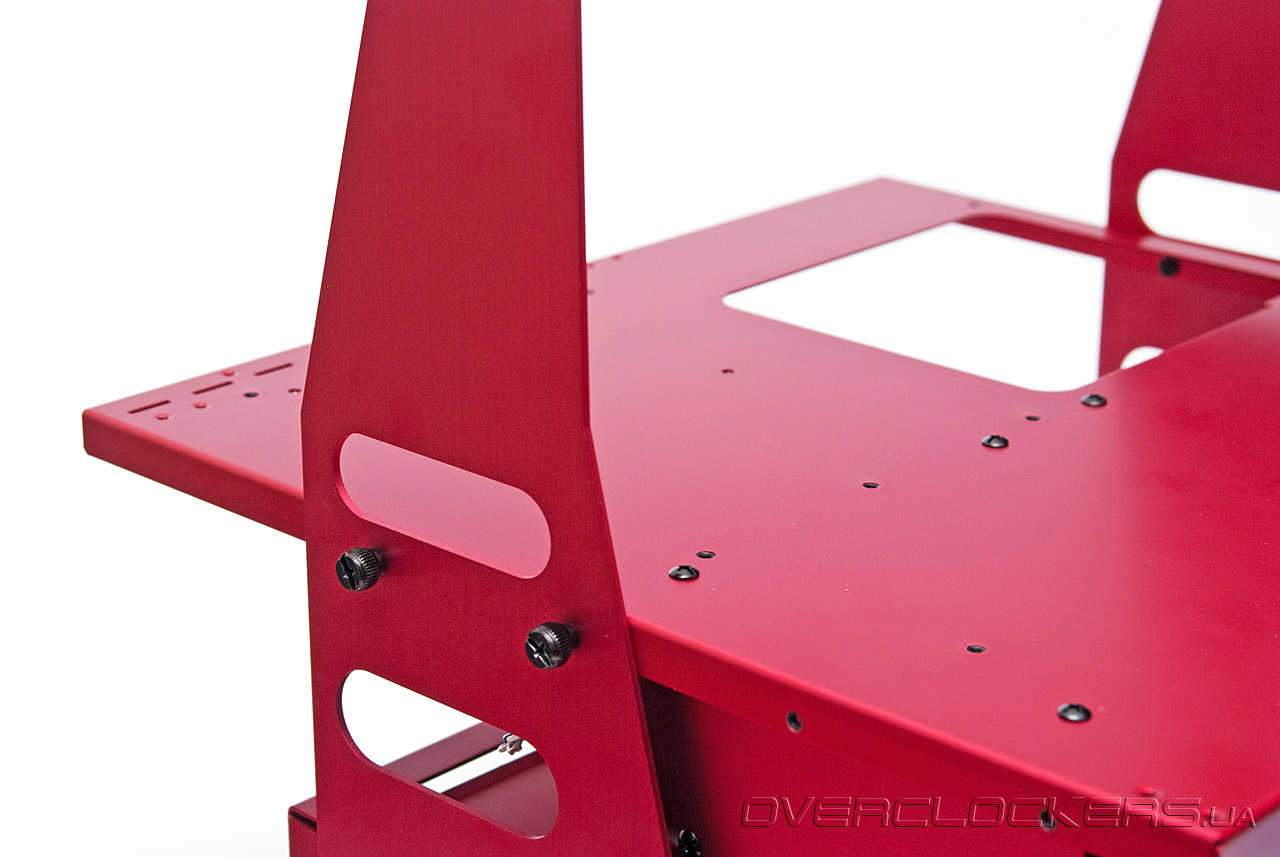 Смотрится великолепно! Кажется все удобно и придраться просто не к чему. Но, познакомившись с ним поближе замечаешь некоторые недостатки. Первое — перекладина мешает быстрой смене видеокарт и систем охлаждения. Даже мешает установке габаритного кулера. Ее постоянно приходится снимать. Второе — вся конструкция, несмотря на сильное затягивание винтов, все же не такая жесткая, как хотелось бы. Стальная рама на заклепках была бы куда прочнее. Но тут дело в используемом материале и ничего с этим не поделаешь. Третье — есть вероятность опрокидывания бенч-стенда назад при установленной массивной СО, если его зацепить. В таком случае желательно использовать достаточно тяжелый блок питания, который будет играть роль противовеса. Производитель даже выпускал опциональную стойку-ножку для этих целей, которая крепилась снизу к поддону с задней стороны корпуса. В нашем экземпляре монтажных отверстий для нее нет, и можно предположить об отказе в дальнейшем выпускать подобный аксессуар.