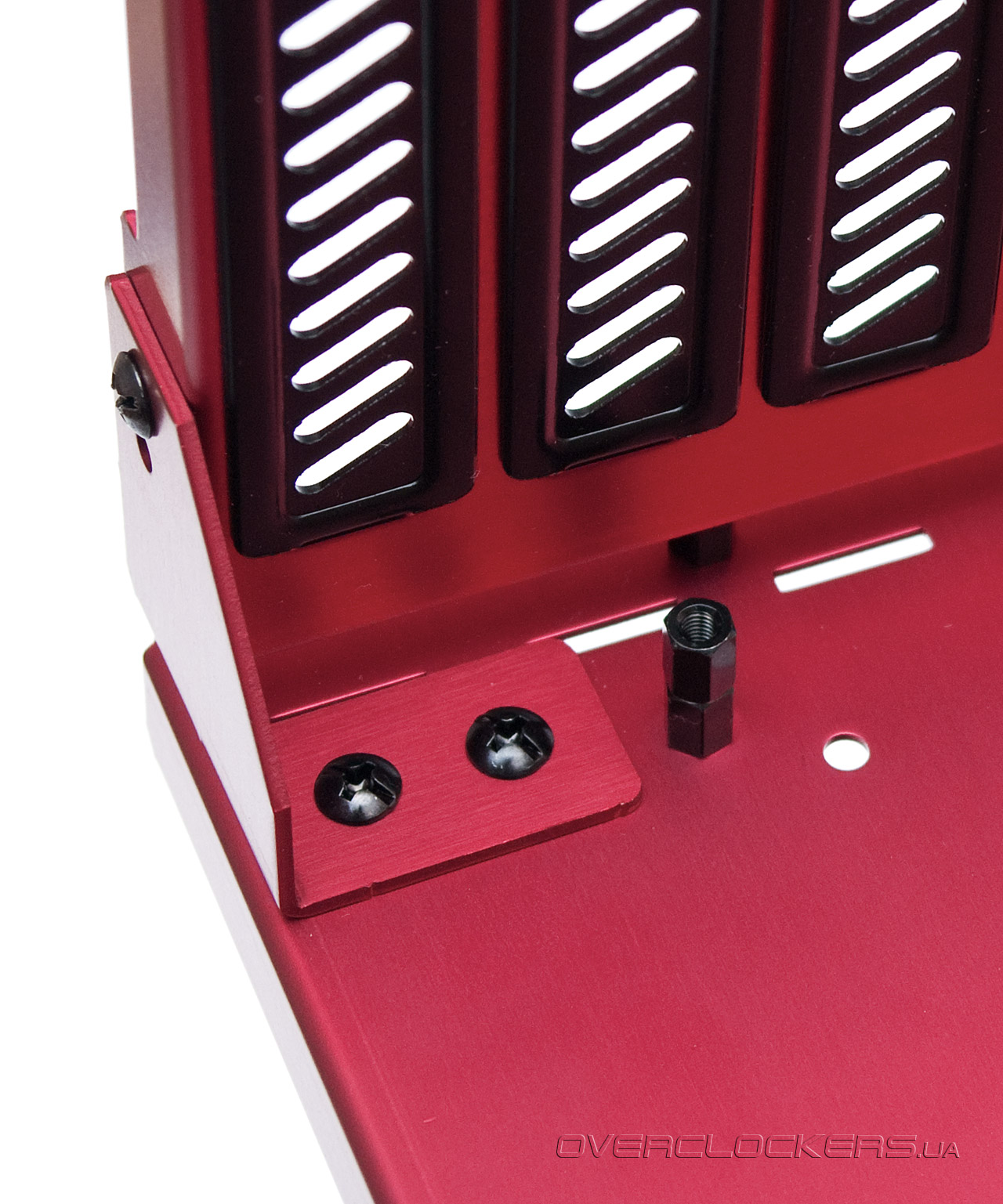 После сборки перекладина крепится на верхних концах боковых стоек. Можно ее установить до или после монтажа материнской планы, кому как будет удобнее. Во все алюминиевые детали, где крепления подвержены сильным нагрузкам (частая смена карт расширения, снятие перекладины, перемещение поддона для платы) впрессованы стальные гайки, которые позволят избежать срыв резьбы в мягком металле.