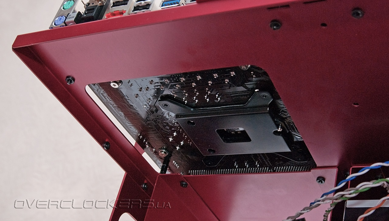 Если заметили, в поддоне есть отверстие, в районе размещения процессора. Через него можно получить свободный доступ к нижней части платы, тем самым менять без проблем системы охлаждения, не разбирая стенд. Очень удобно, кстати.