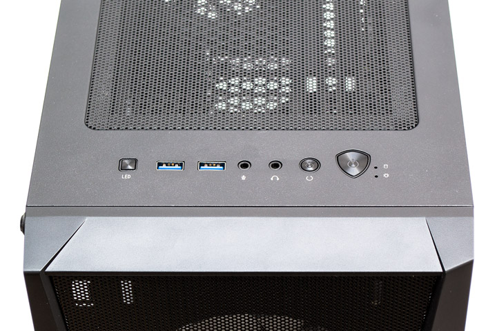 Внешние порты и кнопки расположены в передней части верхней панели. Тут есть мелкая квадратная кнопка переключения подсветки, два синих разъема USB 3.2 Gen1, два 3,5-мм разъема для микрофона и наушников, маленькая круглая кнопка перезагрузки системы. Но наиболее оригинально в виде щита от логотипа сделана клавиша запуска ПК. Справа от нее есть два точечных индикатора питания системы и активности накопителей.