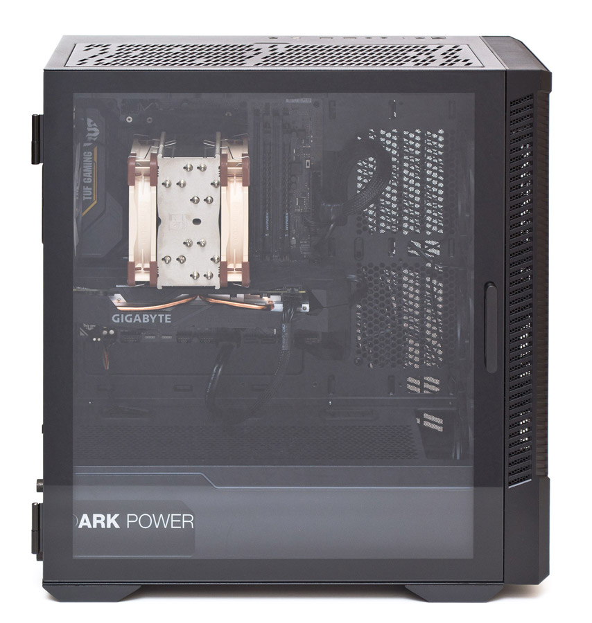 Левая боковая панель полностью выполнена из закаленного стекла, которое подвешено на двух петлях сзади и удерживается магнитами спереди. По центру передней грани есть пластиковая ручка для открывания панели.