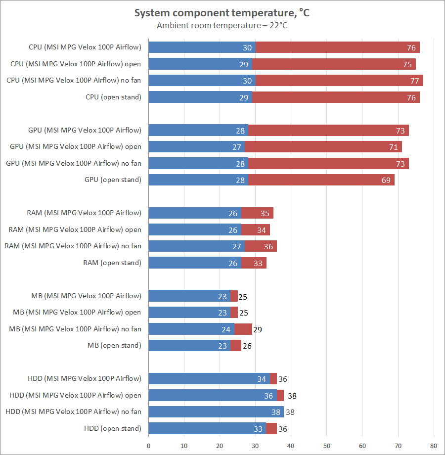Если коротко резюмировать результаты теплового теста, то можно утверждать, что MSI MPG Velox 100P Airflow отлично вентилируется. Даже если просто снять боковую панель и не включать пропеллеры, температуры будут предельно близкими к показателям открытого стенда (в пределах одного-двух градусов). Наибольший разлет показателей можно наблюдать лишь по температуре видеокарты — до 4 градусов разницы с закрытым корпусом.