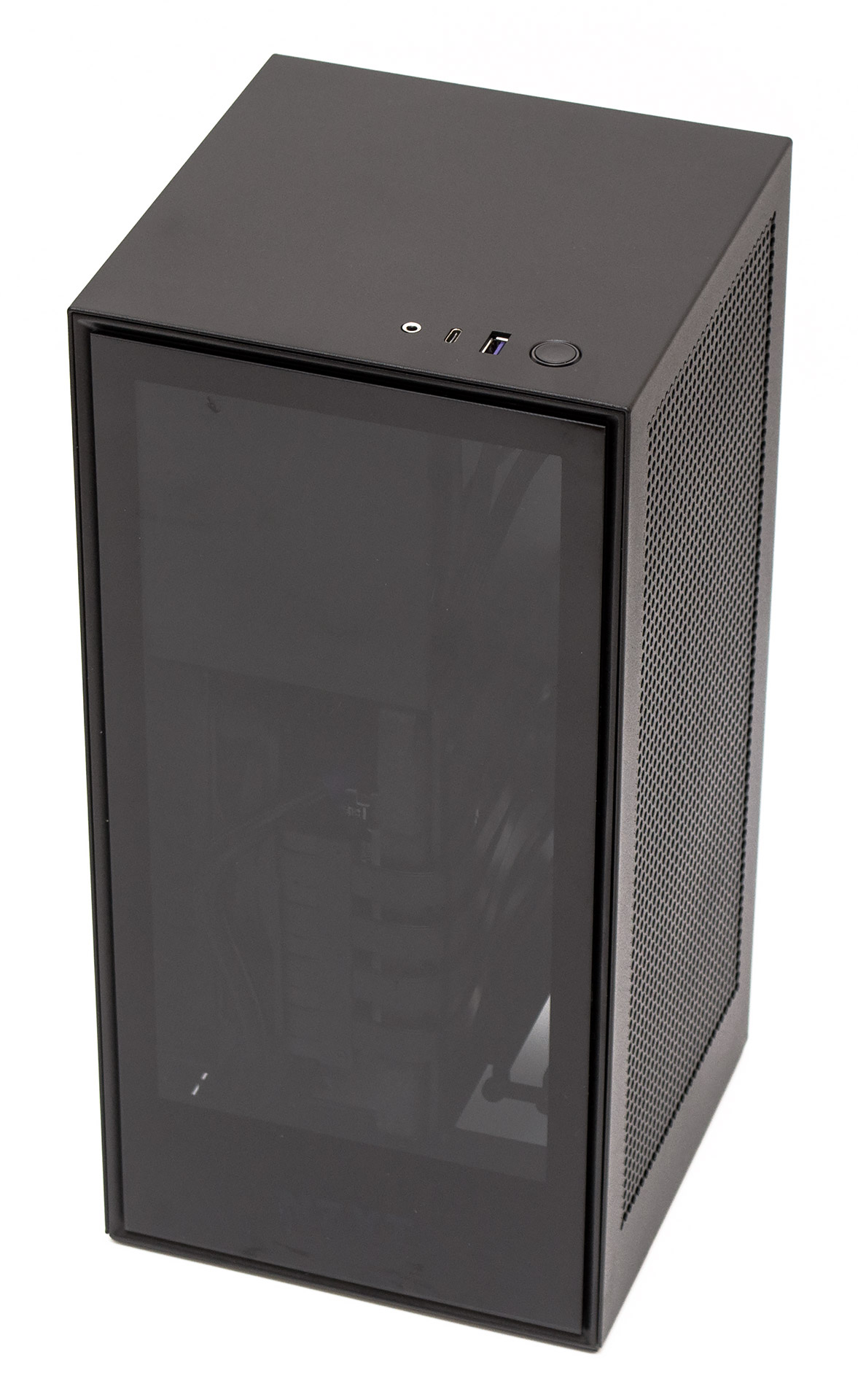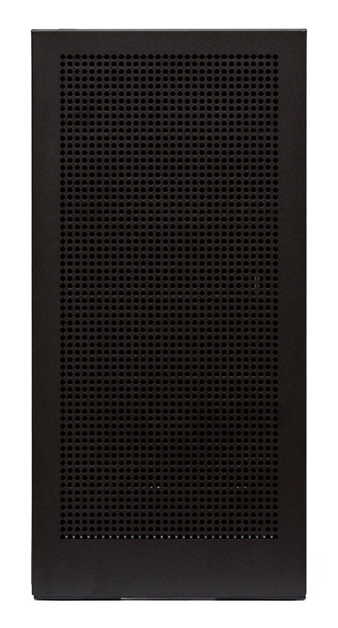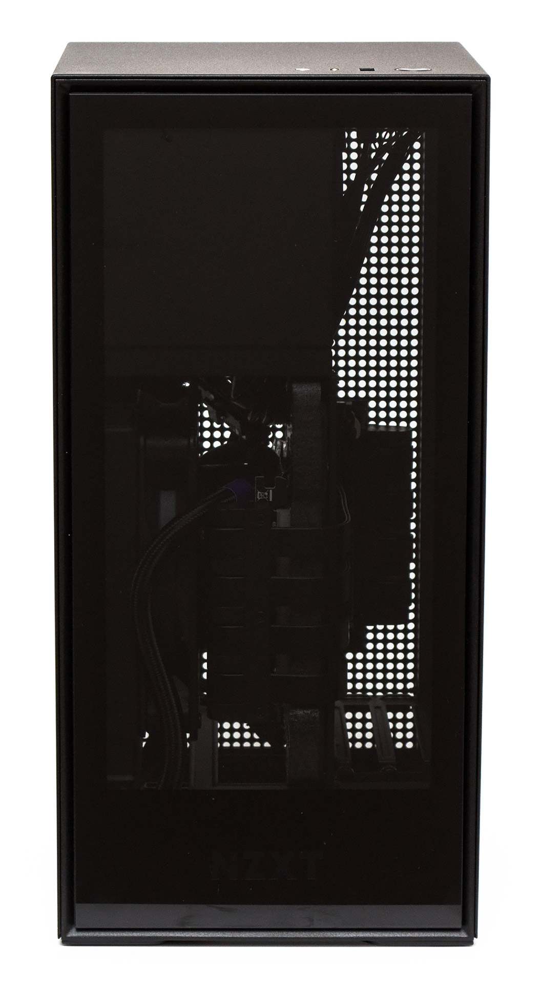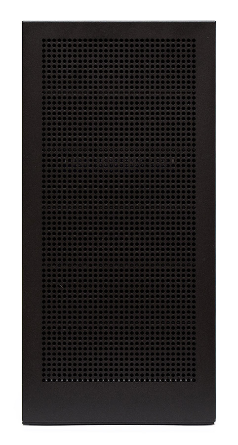 Как и многие другие корпуса от NZXT, шасси H1 выглядит очень лаконично. Оно имеет совершенно прямоугольную форму слегка вытянутого вверх параллелепипеда. В цветовой гамме модели есть только два варианта — полностью черный и черный с белым, где белыми будут лишь две боковые и одна верхняя грань. Размер основания составляет 188х188 мм, а высота не превышает 388 мм. Получается компактная конструкция с объемом чуть меньшим, чем 14 литров. Передняя панель выполнена в своей внешней части из закаленного и сильно тонированного стекла. Через него мало что видно, а из примечательного есть только логотип NZXT внизу. Более практичным решением было бы поставить здесь решетку.