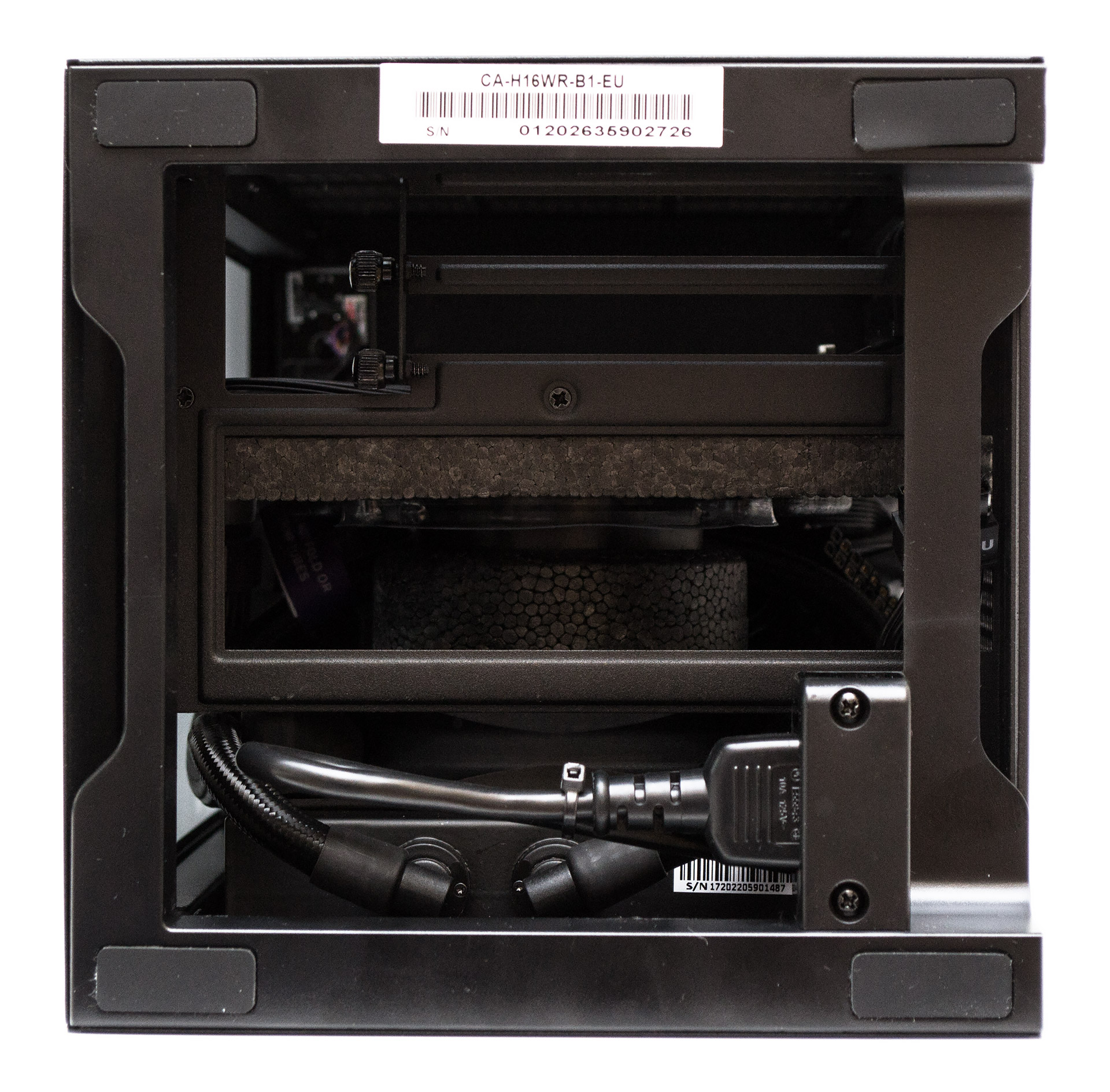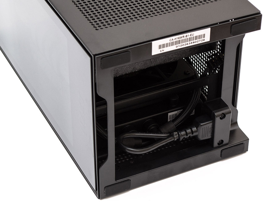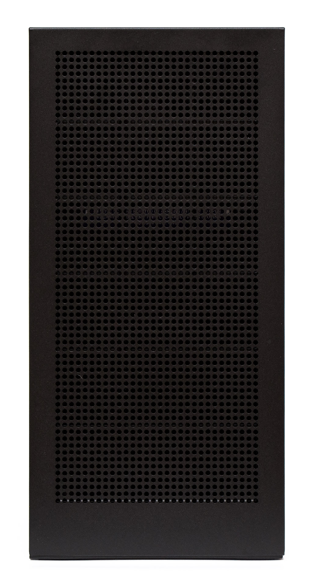 Как и многие другие корпуса от NZXT, шасси H1 выглядит очень лаконично. Оно имеет совершенно прямоугольную форму слегка вытянутого вверх параллелепипеда. В цветовой гамме модели есть только два варианта — полностью черный и черный с белым, где белыми будут лишь две боковые и одна верхняя грань. Размер основания составляет 188х188 мм, а высота не превышает 388 мм. Получается компактная конструкция с объемом чуть меньшим, чем 14 литров. Передняя панель выполнена в своей внешней части из закаленного и сильно тонированного стекла. Через него мало что видно, а из примечательного есть только логотип NZXT внизу. Более практичным решением было бы поставить здесь решетку.