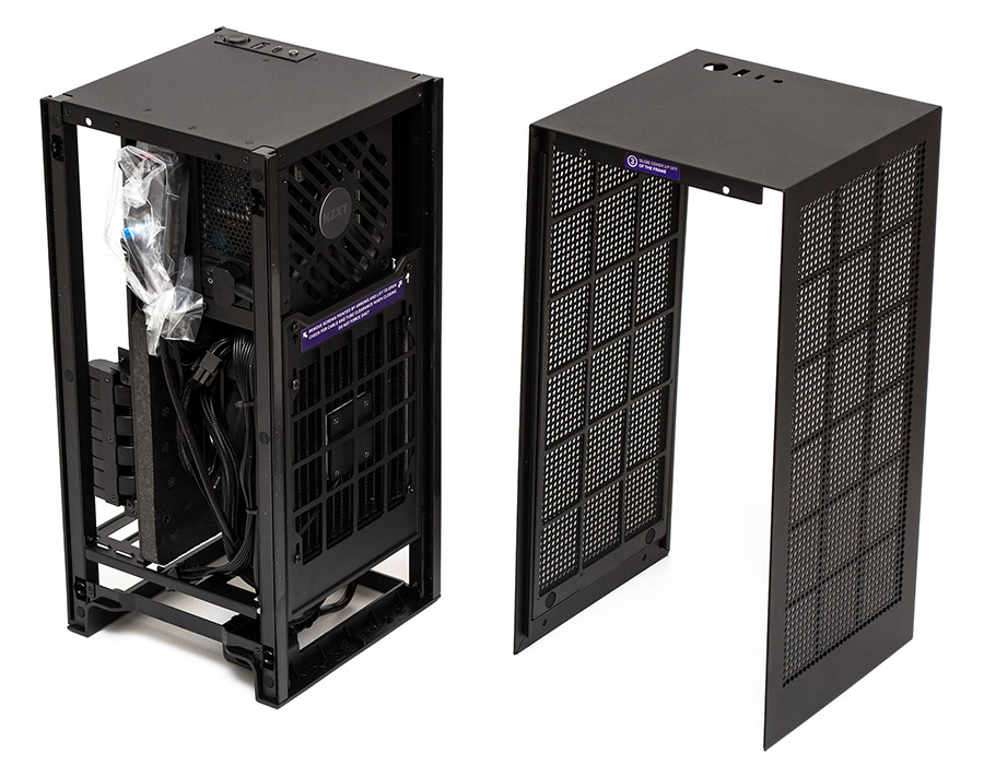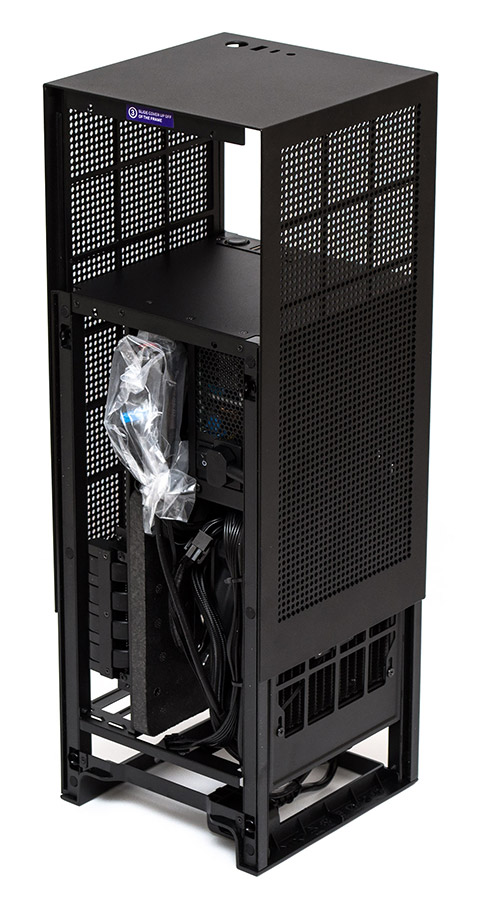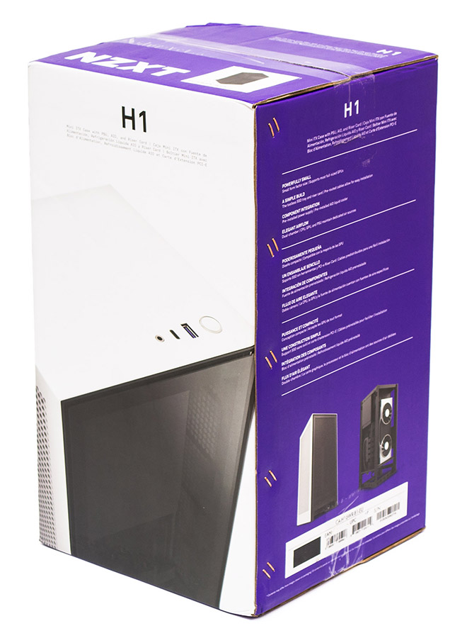 Корпус поставляется в продажу в типичной для NZXT упаковке фиолетово-белого цвета. Она имеет небольшой размер и отличается крайней степенью информативности. Два массивных демпфера из вспененного полиуретана образуют толстую внутреннюю коробку, которая надежно защищает шасси от повреждений при перевозке.