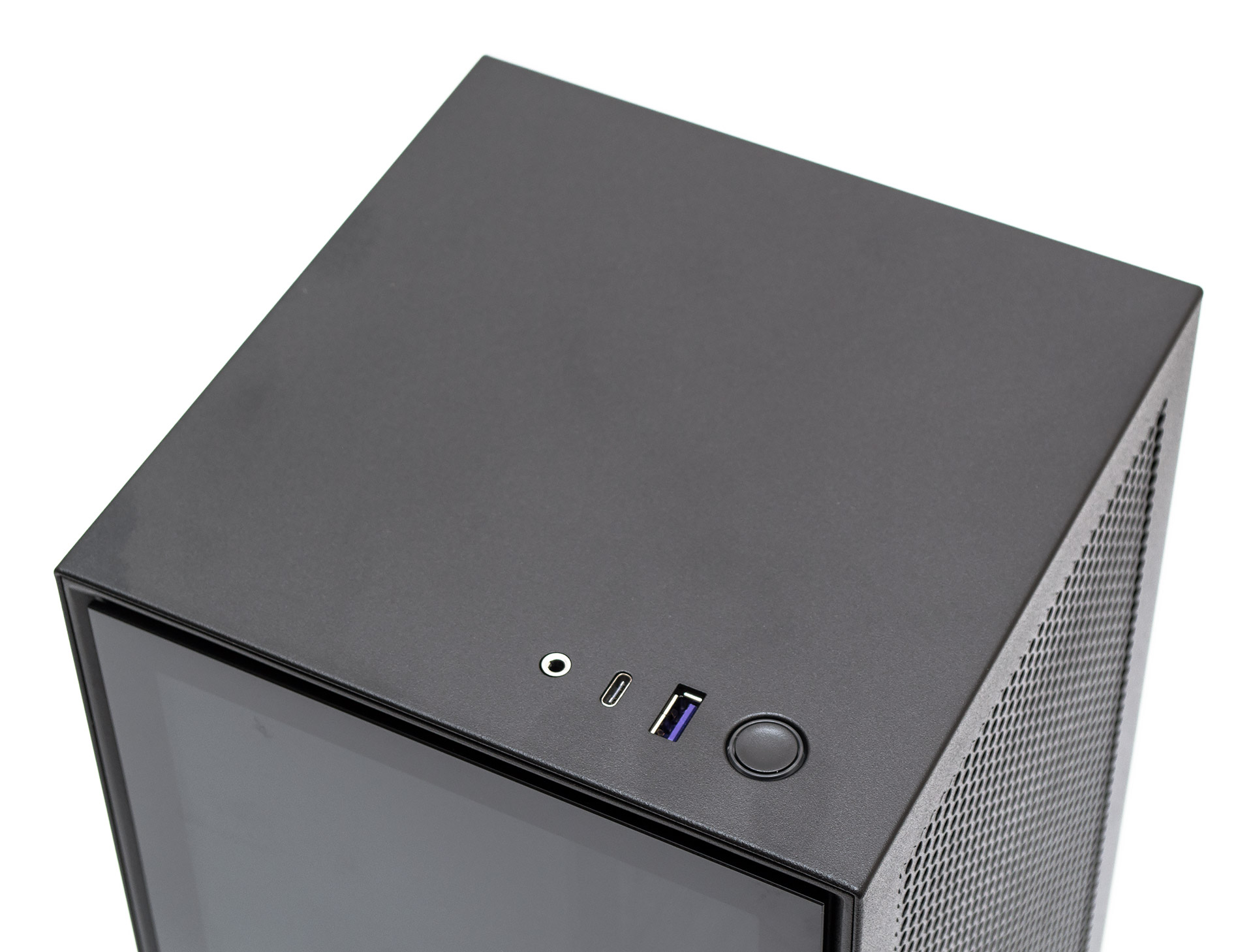 Верхняя панель металлическая и квадратная. Она является монолитной частью с левой и правой панелью. Внешние порты и кнопки находятся впереди справа. Здесь есть совмещенный 3,5-мм разъем для гарнитуры, порт USB 3.1 Type-C, обычный USB 3.1 Type-А фиолетового цвета и круглая клавиша старта системы со встроенным по периметру индикатором питания и активности накопителей белого цвета.