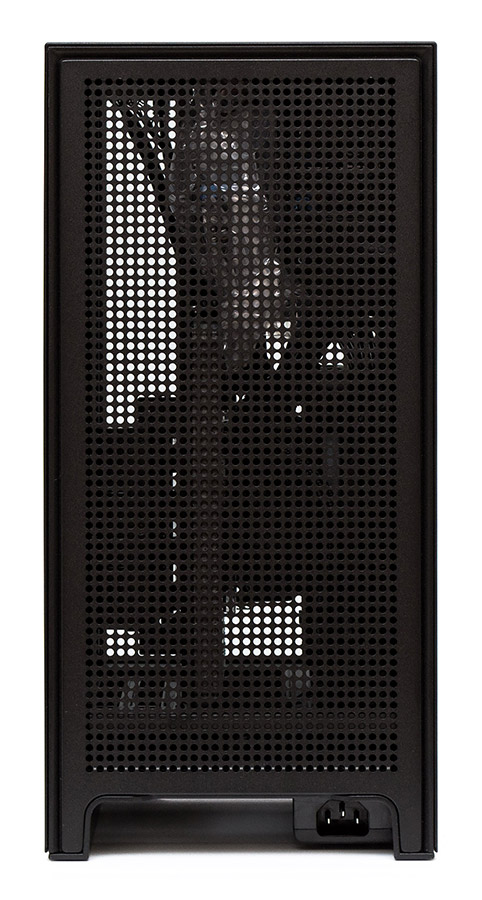 Мало чем отличается и задняя панель. Она почти вся занята вентиляционной решеткой, а снизу находится арочное отверстие для вывода наружу проводов. Справа внизу есть разъем удлинителя для подключения силового кабеля питания.