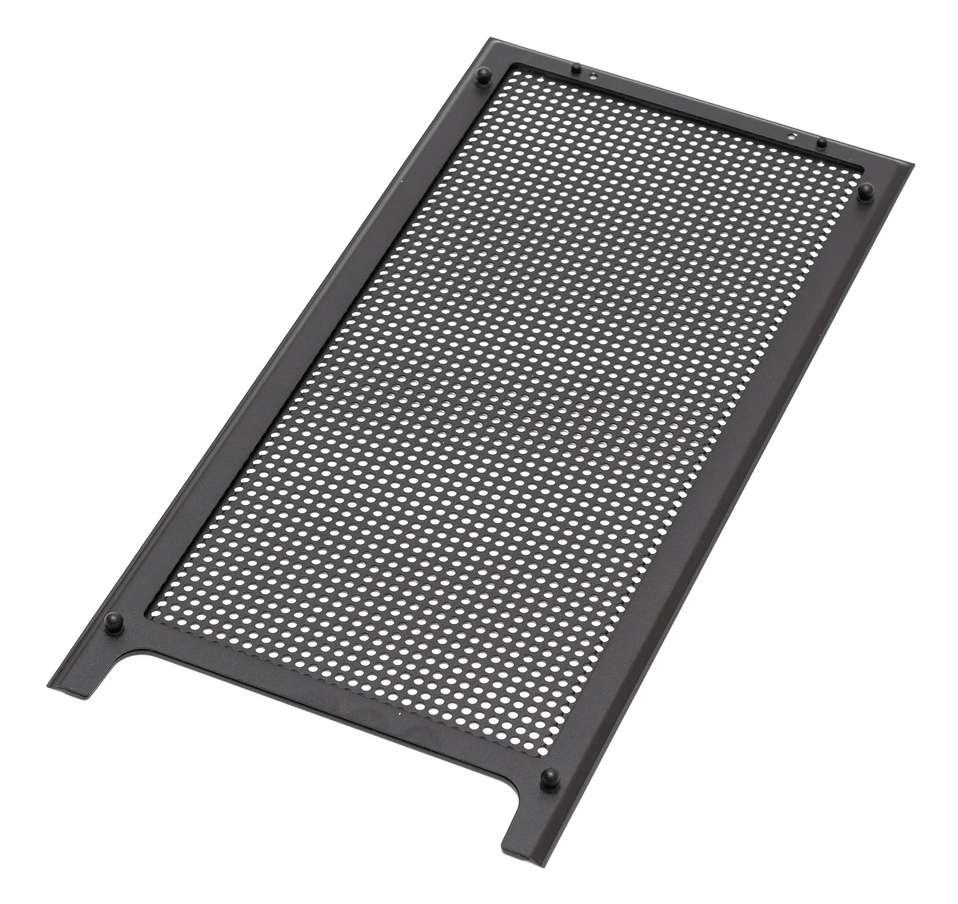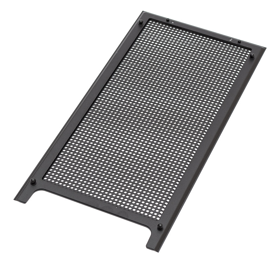 Левая панель металлическая и покрыта обильной перфорацией с круглыми вентиляционными отверстиями.