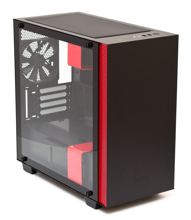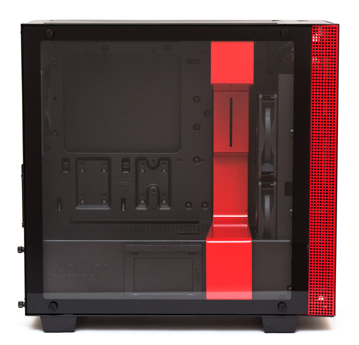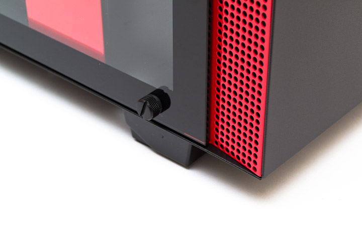 Левая боковая панель выполнена из прозрачного каленого стекла. В передней части корпуса сбоку находится вентиляционная решетка красного цвета.
